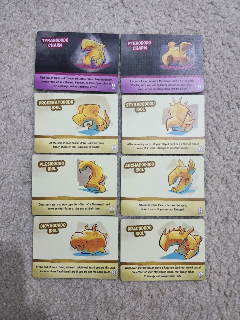 1x Archaeododo Charm (Yellow card): Whenever other racers become enraged, draw 3 cards if you are not enraged.