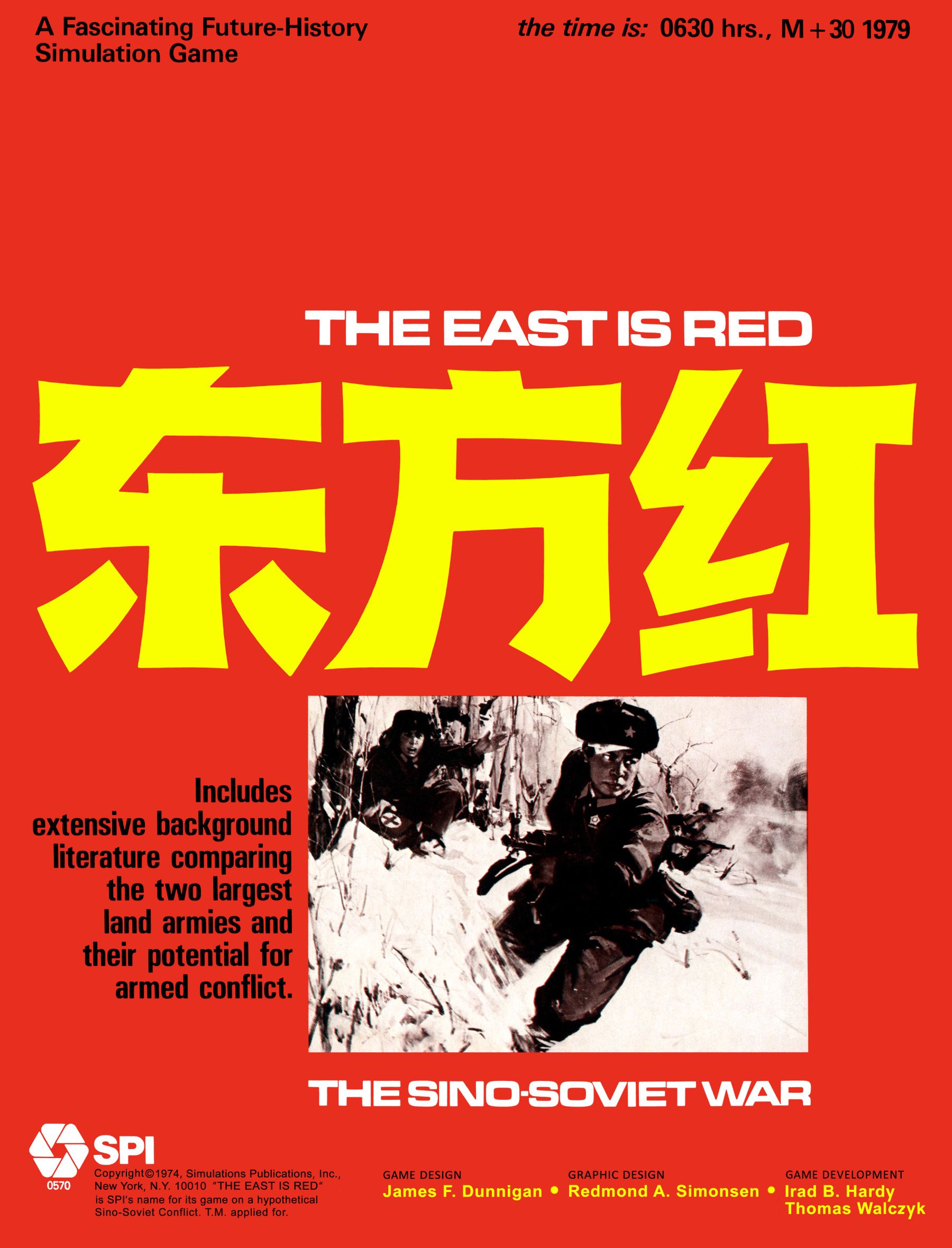 The East is Red is a simulation on a strategic/operational level of a possible attempt by Soviet forces to invade and occupy Manchuria and North China sometime in the 1970s. Within the theatre of operations it is assumed that tactical nuclear weapons and atomic demolitions will be used. The game is played with variants of two basic scenarios. The M-1 scenario variants postulate a hasty Soviet attack into China and the M-30 variants describe a later stronger attack.