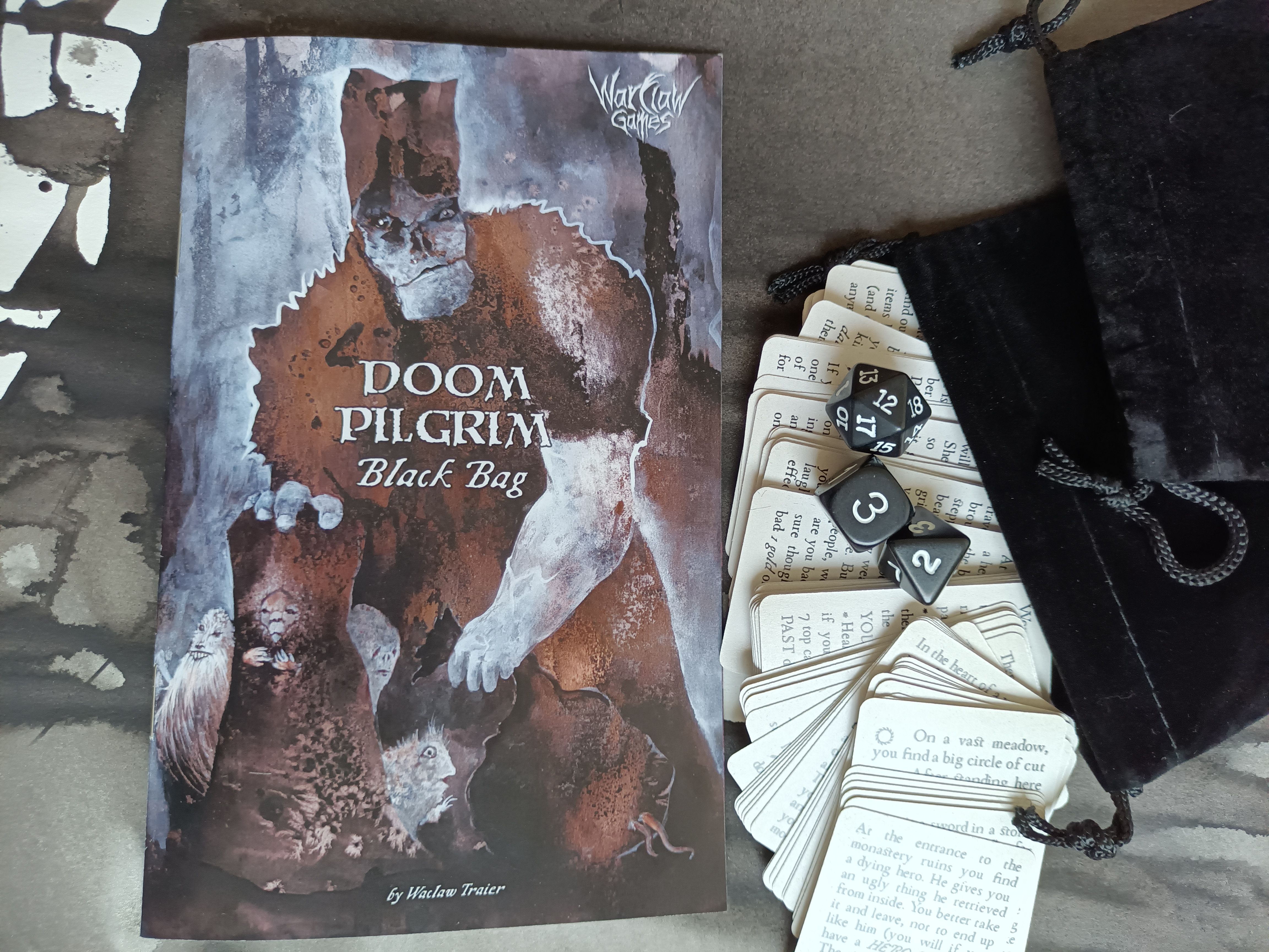 Descrizione: This is a supplement for the Doom Pilgrim and Doom Pilgrim Pocket card game, compatible also with all its current and future expansions. Black Bag brings 192 random events on mini-cards that are going to be drawn randomly from the included bag. Cards are double sided, text only. Illustrations are in the enclosed booklet which describes how to use these cards. The booklet also contains rules on how to use dice if you want to add them to your Doom Pilgrim (or Doom Pilgrim Pocket) adventure. We call this novelty the "DOOM PILGRIM Dice System". Dice you would need are also included. —description from the publisher