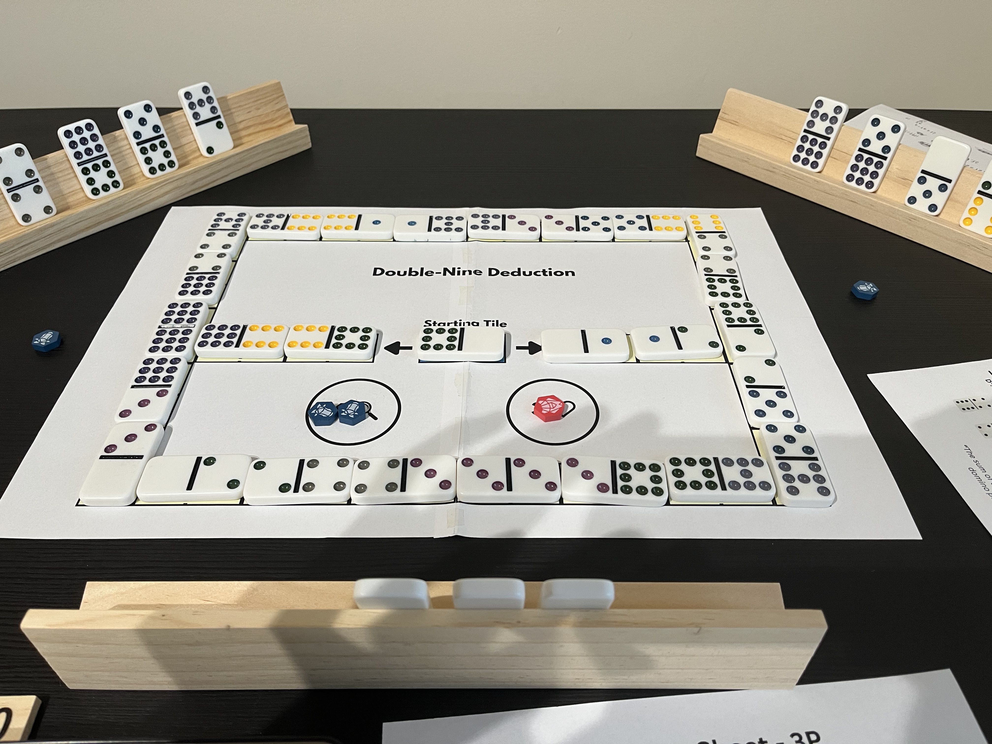 Descrizione: Double-Nine Deduction is a print n' play cooperative deduction game for 2-4 players. The goal of the game is to play 26 dominoes onto a shared player board so that each of the dominoes played connects to an existing domino chain on the board. Players cannot see the faces of their dominoes and must give clues to the other player(s) to help them deduce what's on their domino faces. Clues are simple on the surface (identify eligible pairs of domino ends that have a specific sum or difference), but can lead to some truly satisfying deductive moments. Double-Nine Deduction plays well at all player counts, and is a rare case of a cooperative deduction game that shines at two-player. —description from the designer