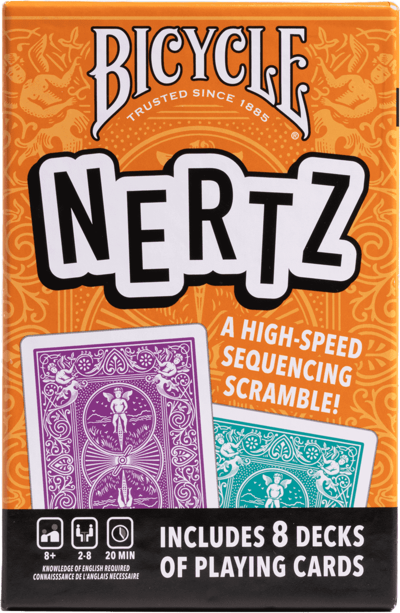 Descrizione: Nertz, also known widely as Pounce, is a fast paced card game where every player has their own standard deck of cards and engage in a form of multi-player solitaire. Decks with different backs are a must. Players all deal 13 cards into a draw pile and four cards out in front of themselves. When play commences, players simultaneously try to empty their draw pile by building on the four cards in front of them (red sevens on black eights, black sixes on red sevens etc.) and try to put cards into set piles in the middle of the table starting with the Ace of a given suit and then the two and three and so on. Players build on each others' set piles so this can lead to some very energetic competitions. The remaining cards that a player has are kept in a deck and counted out and turned over three at a time, placed face up, and then the top facing card can be added to the set piles or to the four working piles in front of the player. When a player has emptied the draw pile and yells out "Nertz" play stops and points are counted up - one point for each card in the middle of the table in the set piles, and -2 points for every card left in the draw pile. First player to an agreed upon score is the winner.