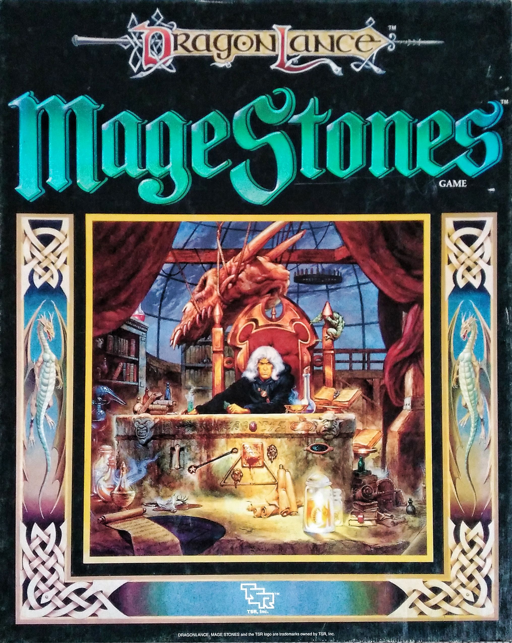 Descrizione: Very vaguely themed to the AD&D Dragonlance campaign background. The board is a grid 7 x 9, with columns numbered 3-9, columns representing planes of reality, rows representing schools of magic, though this has no effect on gameplay. The board "wraps" top to bottom, but not for the purposes of diagonal capture.