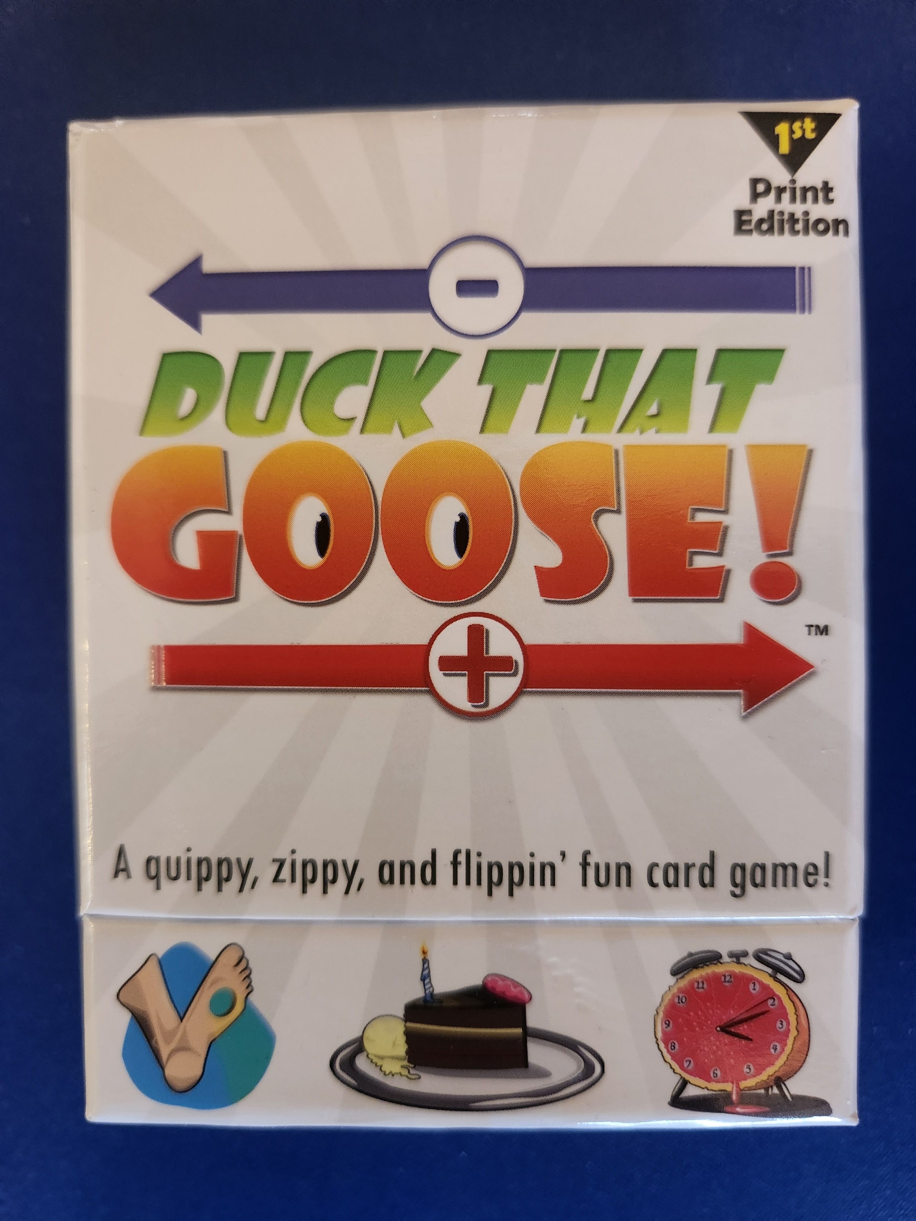 Descrizione: Duck That Goose Invites players to outsmart opponents in a comical quest where fortune flips with the cards. With a deck of sixty-nine whimsically designed cards, players navigate the twists of fate, all while evading a wild good chase. Will you float on cloud 9? Or shoot yourself in the foot? Risk the ire of the table… and you may get thrown under the bus or have your bubble burst. Every round is an unpredictable riot!