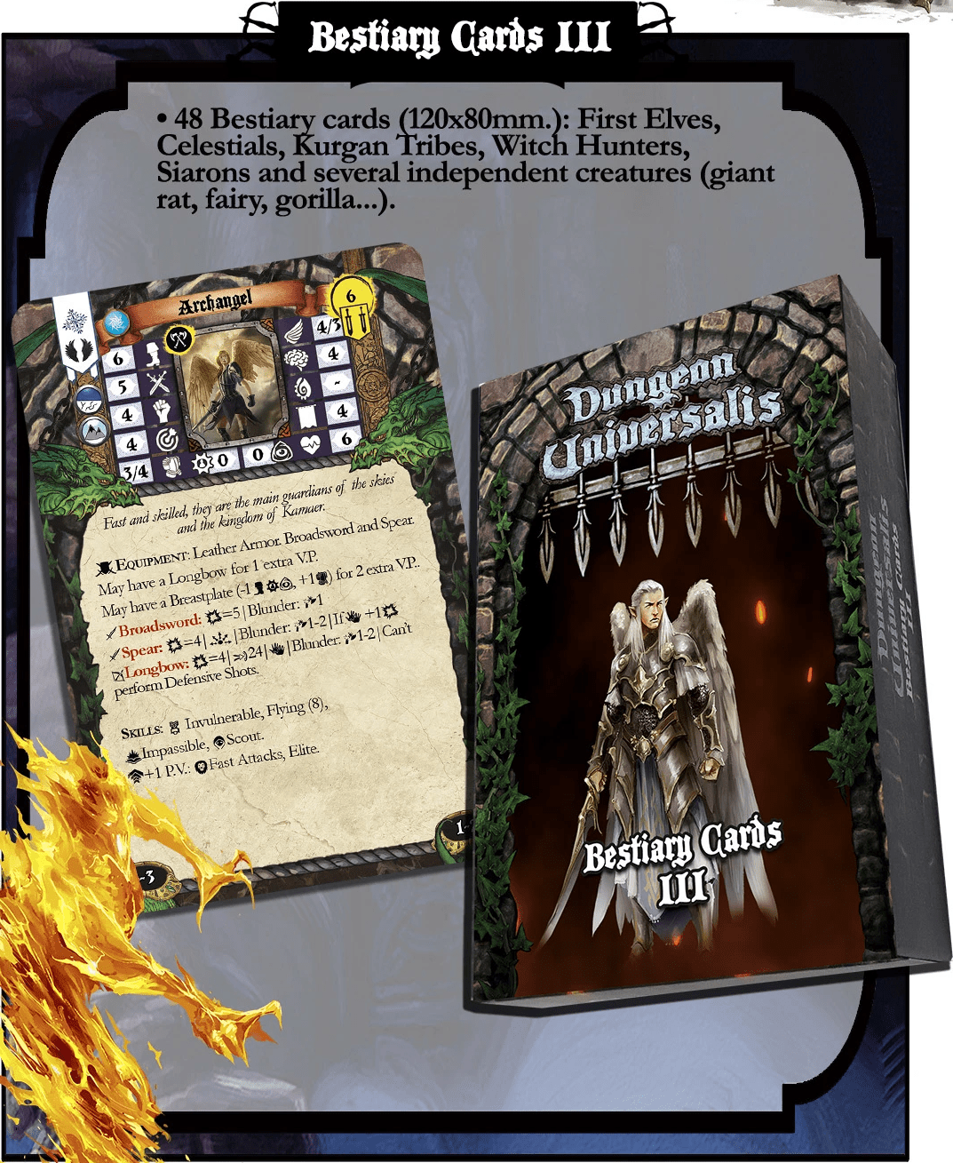 Contiene las facciones cuyos standees ya están incluidos en la caja Standees Bestiary II: Primeros Elfos, Celestiales, Tribus Kurgan, Cazadores de Brujas, Siarones y varias criaturas independientes (rata gigante, hada, gorila..)..