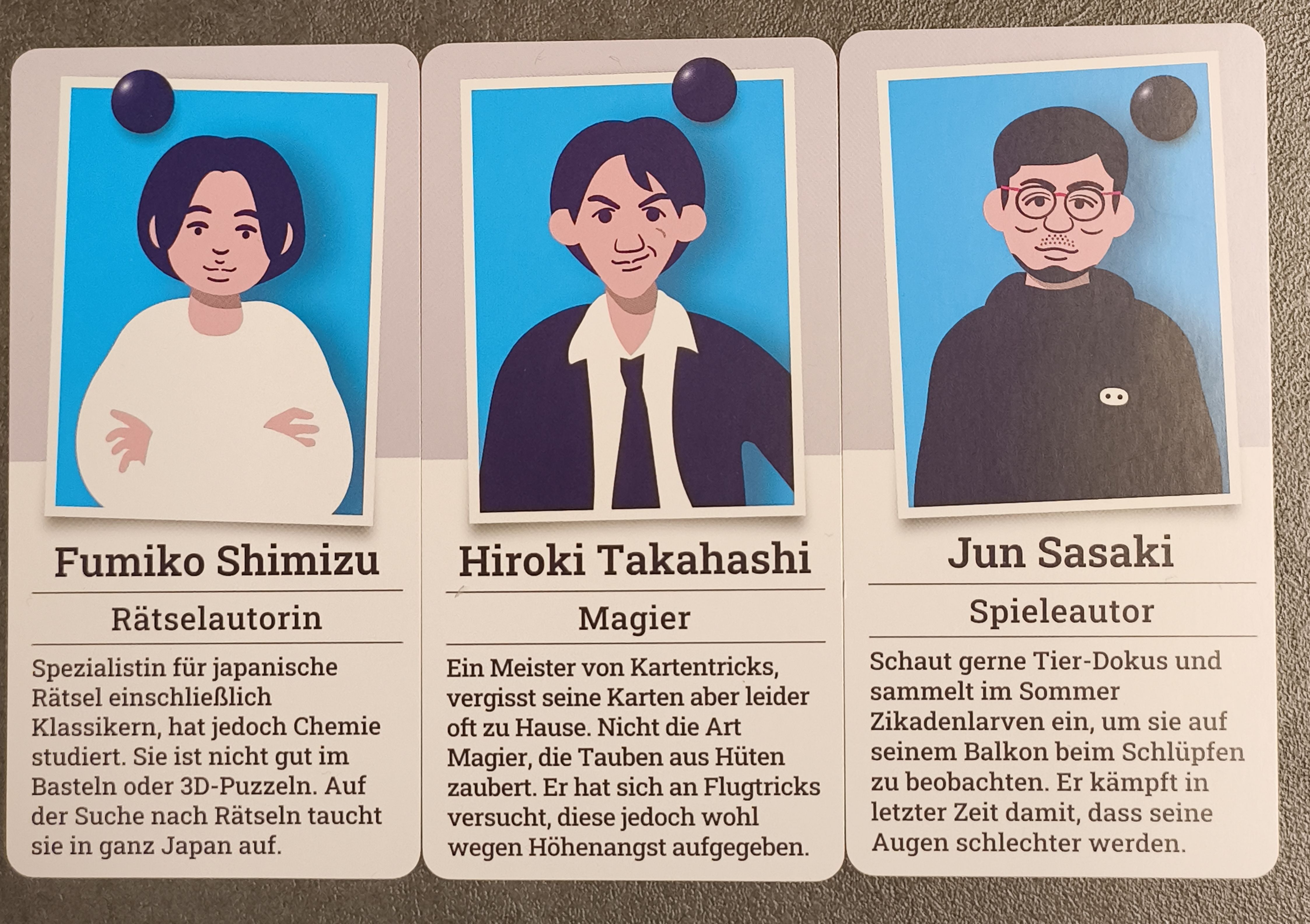 Jun Sasaki, Spieleautor, schaut gerne Tierdokumentationen und sammelt im Sommer Zikadenlarven, um deren Schlüpfen auf seinem Balkon zu beobachten. In letzter Zeit kämpft er mit nachlassendem Sehvermögen.