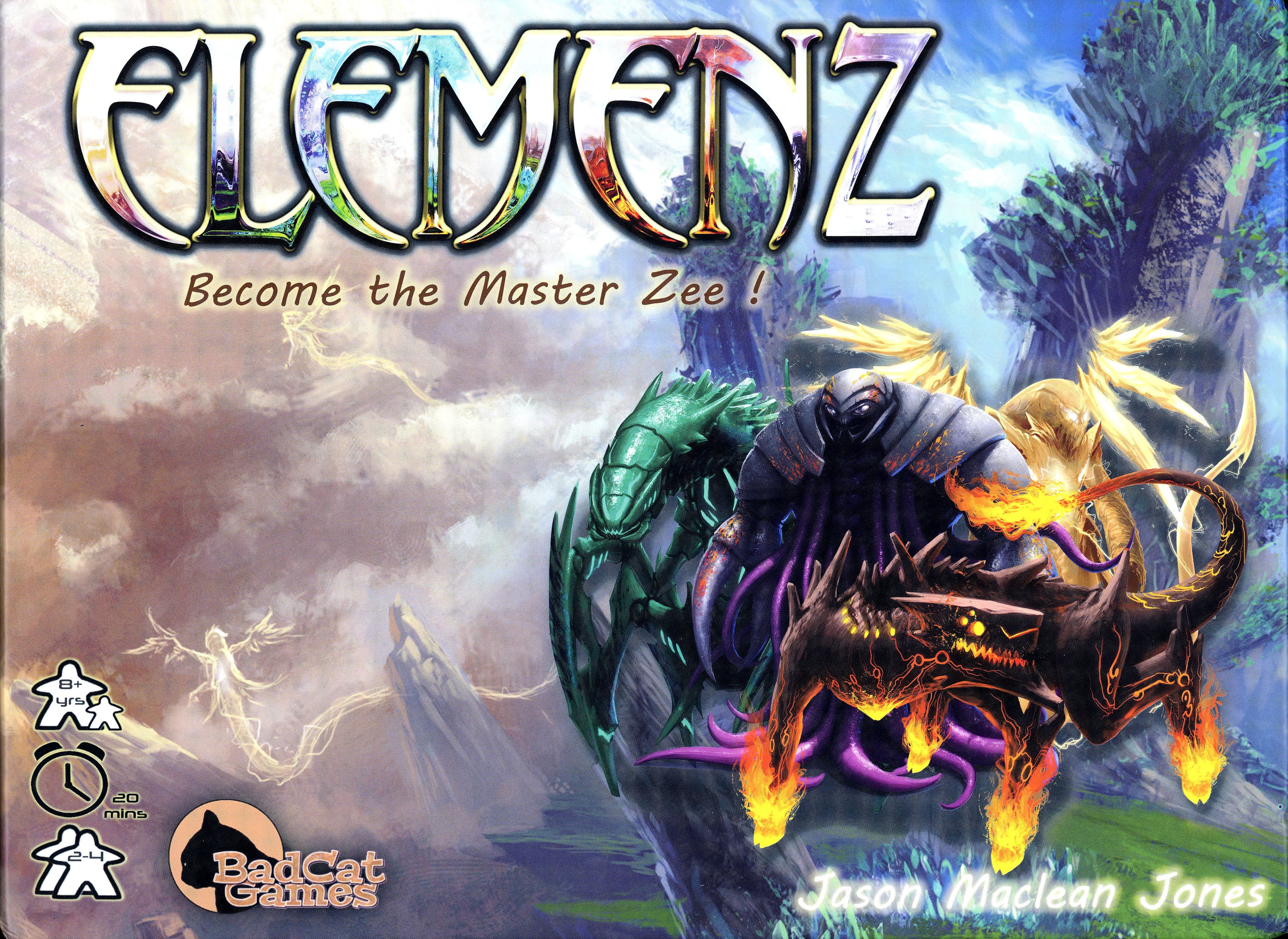 Descrizione: ElemenZ is a simple to understand and relatively quick dice-rolling challenge game. Incorporating a push-your-luck style of play with 4 sets of custom dice. In each game, multiple tactical 'combo' options allow a player to drain opponents of their dice, while trying to control the wild element 'Z' and convert it to one of the four main elements of Air, Earth, Fire and Water. Each player chooses from four different alien races, Master of a single element, each with variable race powers - in a battle to become the Master Zee.