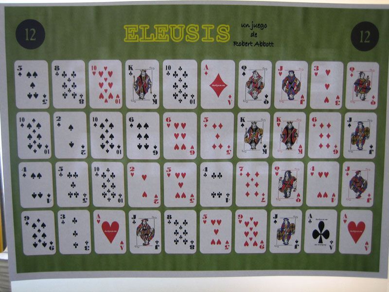 Descrizione: Eleusis (and later New Eleusis, 1976) is a card game that simulates the scientific method in action. You need two packs of cards, a table and some paper and pencil to play. The 4-8 player range works best.