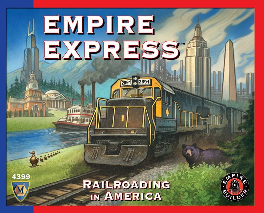 In Empire Express, designed to be an easy-to-play introduction to the Empire Builder series of games, players create competing railroad empires by drawing railroad tracks with crayons upon an erasable board. You win if you utilize your network of rail lines to acquire and deliver goods efficiently to accumulate the largest personal fortune!