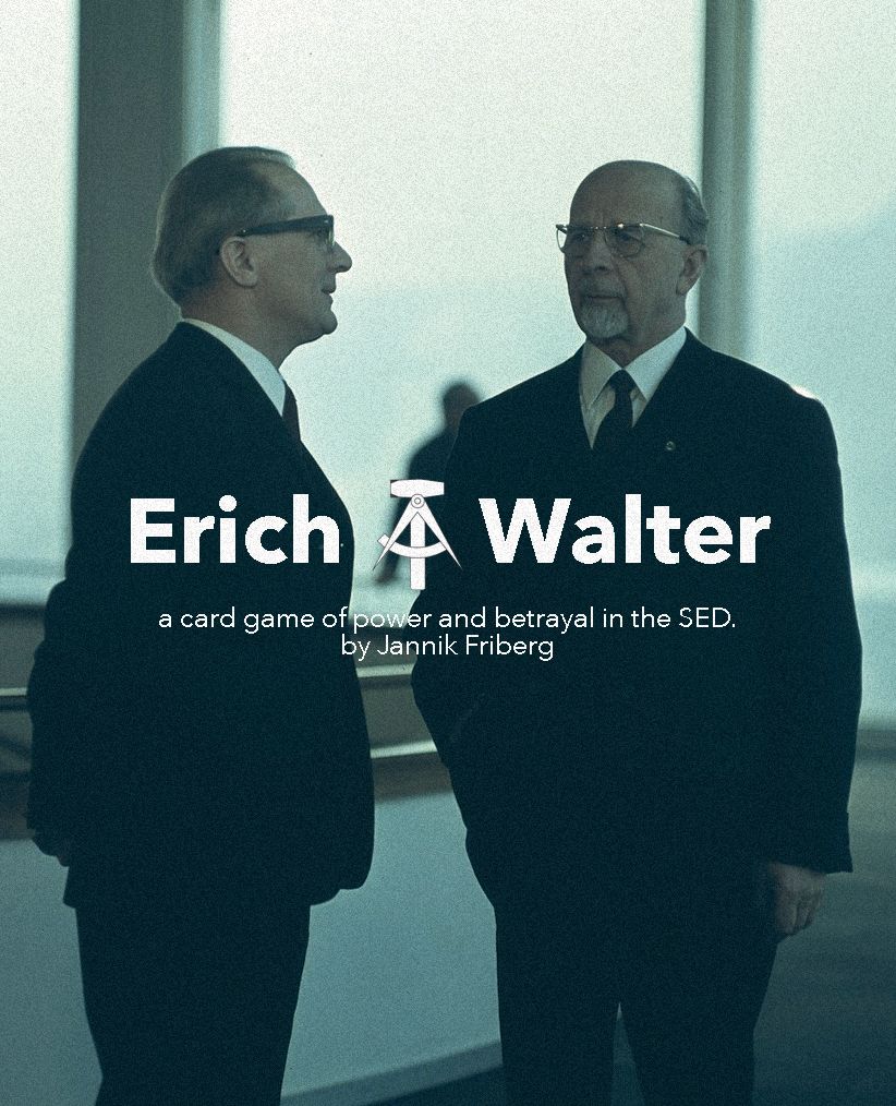 The card game Erich & Walter (2025) explores this muted political rivalry between Erich Honecker and Walter Ulbricht, as they struggle for control and leadership of the SED and the East Democratic Republic (GDR). Players navigate the shifting domains of the GDR’s public, the Party’s Politburo, and Soviet favor, balancing ideology, influence, and intrigue to outmaneuver each other and seize leadership of East Germany.