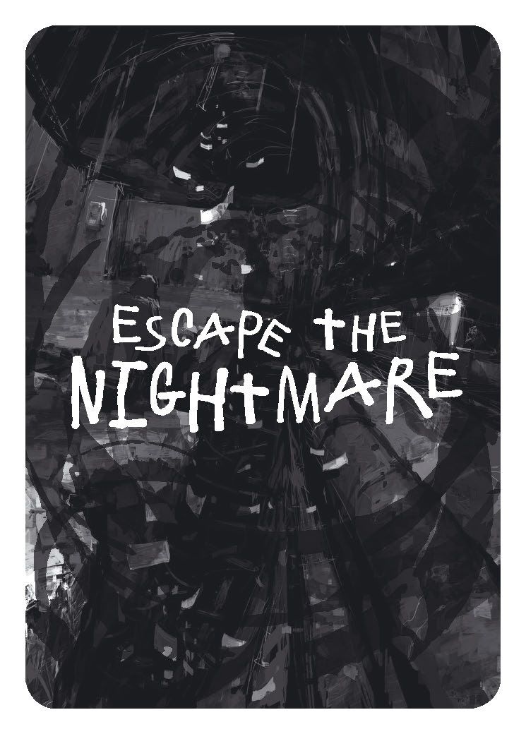You play as a group of friends inhabiting a shared nightmare. Your hand consists of nightmarish aspects and you goal is to trade these with your friends. If someone can get a collection of similar aspects then they can master that part of the nightmare and contribute to your eventual escape - however each card that you receive in trade can force you to undertake certain actions, restrict who you trade with or limit how you can communicate. To make matters worse something is chasing you through the nightmare and you have to trade its card every ten seconds or be devoured. It's coming. Run.