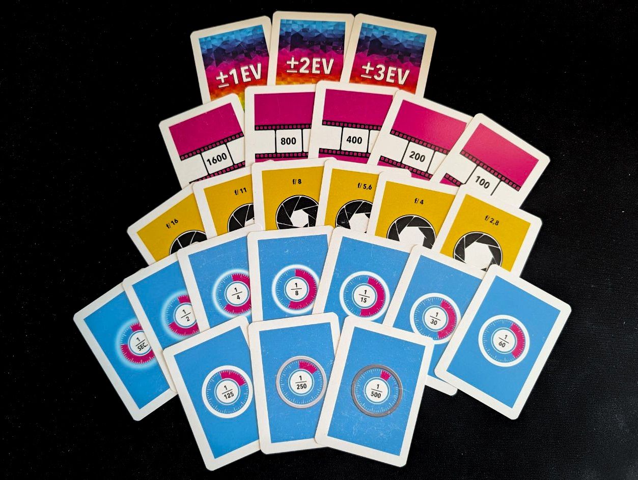 The cards. There are 4 types of cards: 24 image cards, each depicting a scene with the technical data for the shot (shutter speed, aperture, and ISO); 20 aperture cards; 20 shutter speed cards; 20 ISO cards (film sensitivity to light); 3 Joker cards with a value of 1, 2, or 3 stops.