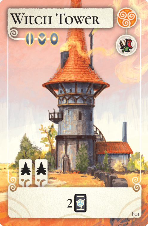 Descrizione: New Place of Power which provides a resource when harvesting and requires two witches to discover. The binding bonus allows drawing two cards from the deck.