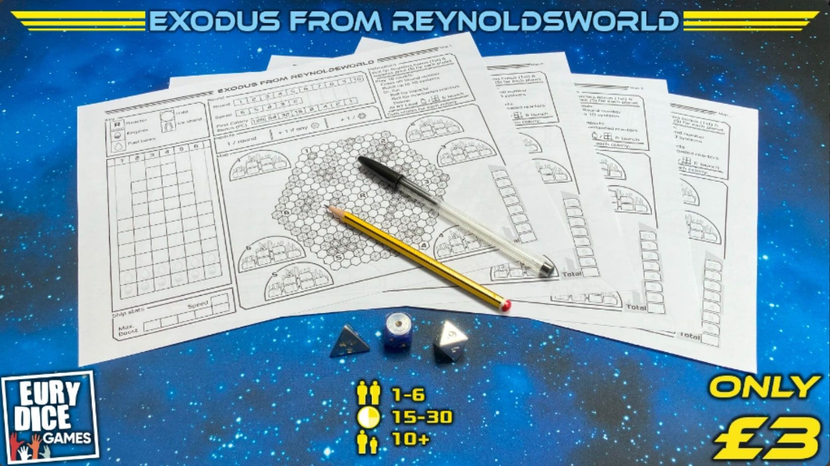 Descrizione: Reynoldsworld is under threat from an encroaching alien armada. Millions of people need to be somewhere else. Fast. You will build an ark and ferry the population and the supplies they need to nearby habitable worlds. Will your efforts be remembered as the saviours of Reynoldsworld, or just were you there to help out? Exodus is a print at home roll & write game in which you design a ship and then brave dangerous space to save a planet full of people!