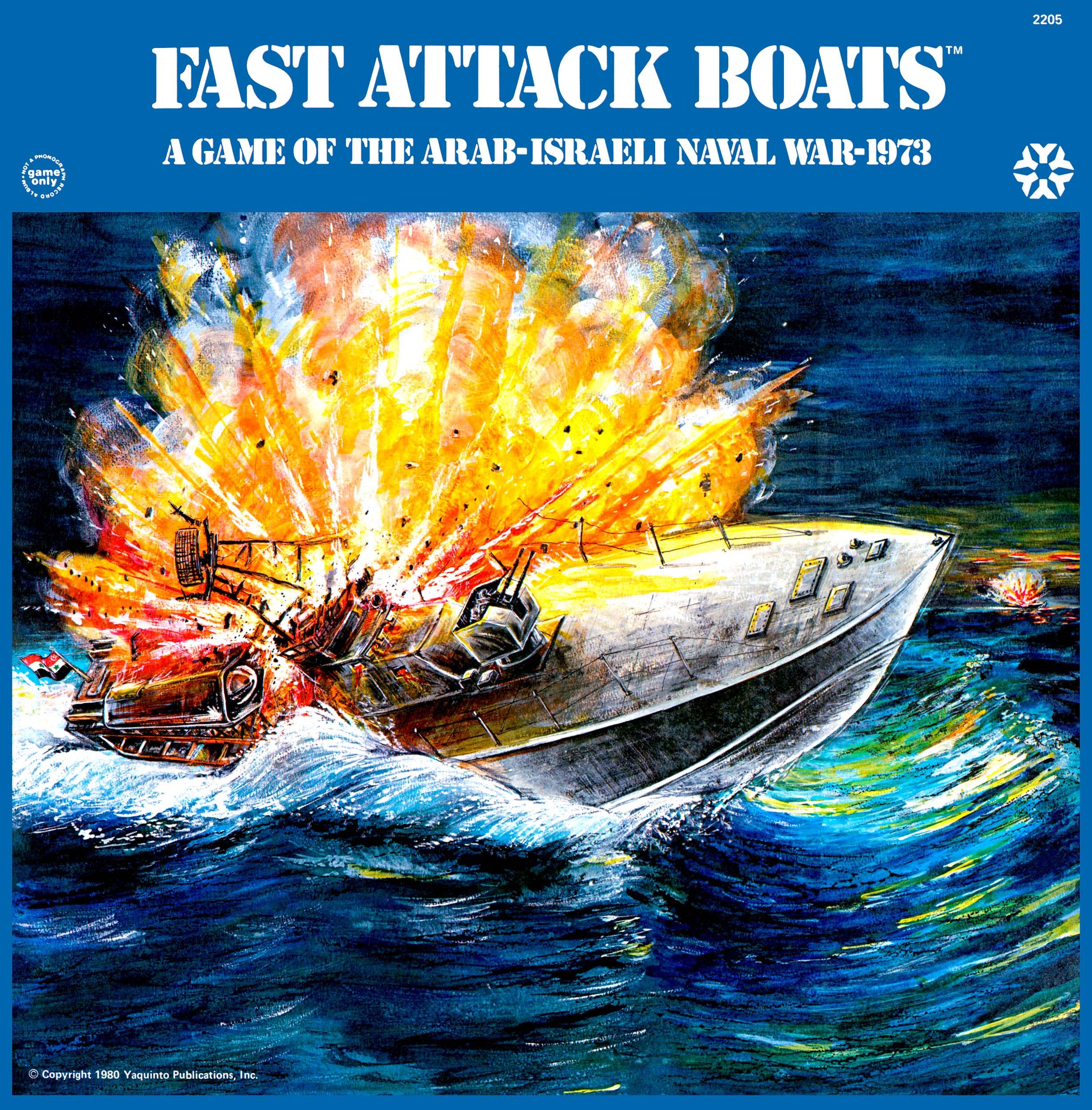 Descrizione: "Fast Attack Boats: A Game of the Arab-Israeli Naval War 1973" is a hex and counter wargame covering the flavor of naval actions during the Arab-Israeli War of October 1973. Each player controls one or more small naval craft and attempts to sink the other with missiles, torpedoes, guns, and ramming. A Yaquinto Album Game.
