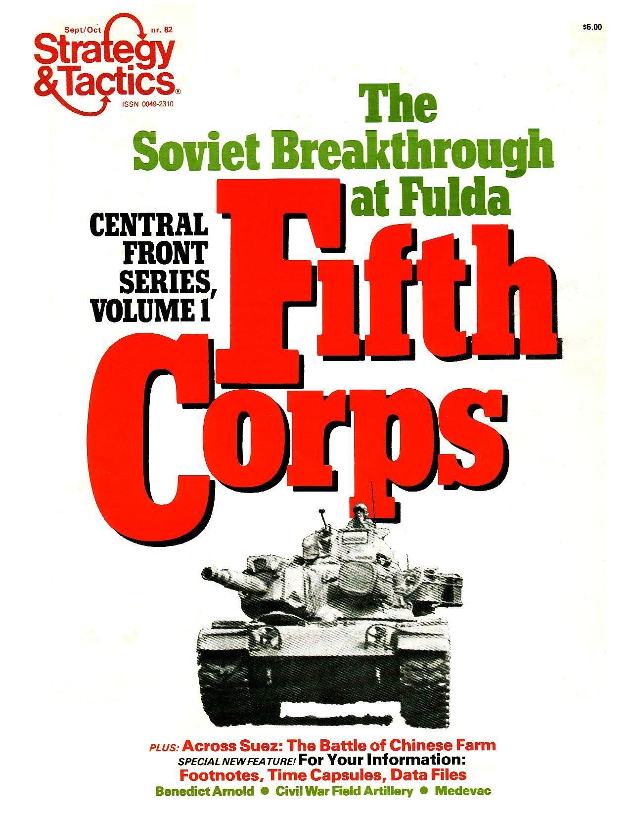 Descrizione: "Fifth Corps: The Soviet Breakthrough at Fulda" is one of several games in the Central Front Series published by SPI in the 1980s. "Fifth Corps" appeared in the September/October 1980 issue of Strategy & Tactics magazine #82. Both the game and series depict the early days of World War III in West Germany. Combat is conducted at the company, battalion, and regiment level, with a map scale of 4 km per hex. The map covers the Fulda Gap and includes the major West German cities of Frankfurt and Mainz.