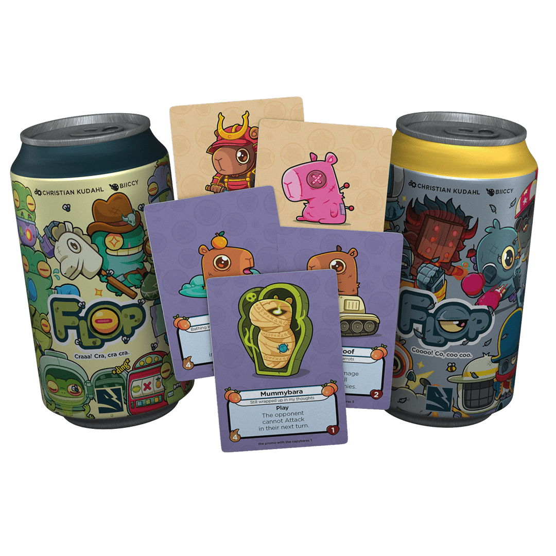 Descrizione: FLOPPING is the masterful art of ultimate underachieving. You win by doing... absolutely nothing. No cards to play? No enemies to attack? Boom. You’ve FLOPPED. And you’ve WON. But wait, there's more. There is also, The Secret Crew: The Capybaras. Silent. Round. Unbothered. —description from the publisher A promo of 5 capybara themed cards to include with either Flop: the one with the Frogs or Pigeons. Citrus Steve - Copy an ability of a card in the discard Curse- ybara - Stop players playing cards for a turn Mummybara - Stop a player from attacking for a turn Shogun Squeaks - Damage all undamaged in play cards General Floof - Double existing damage on all in play cards