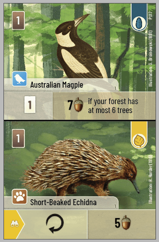 Descrizione: Promo P017 for Australien market. Also given at Europe Masters 2025 at SPIEL, Essen. UP - Australian Magpie (cost 1, dark blue tag): EFFECT, draw one card 7 VP if your forest has at most 6 trees DOWN - Short-beaked Echidna (cost 1, yellow tag): IF BONUS, do one more action 5 VP