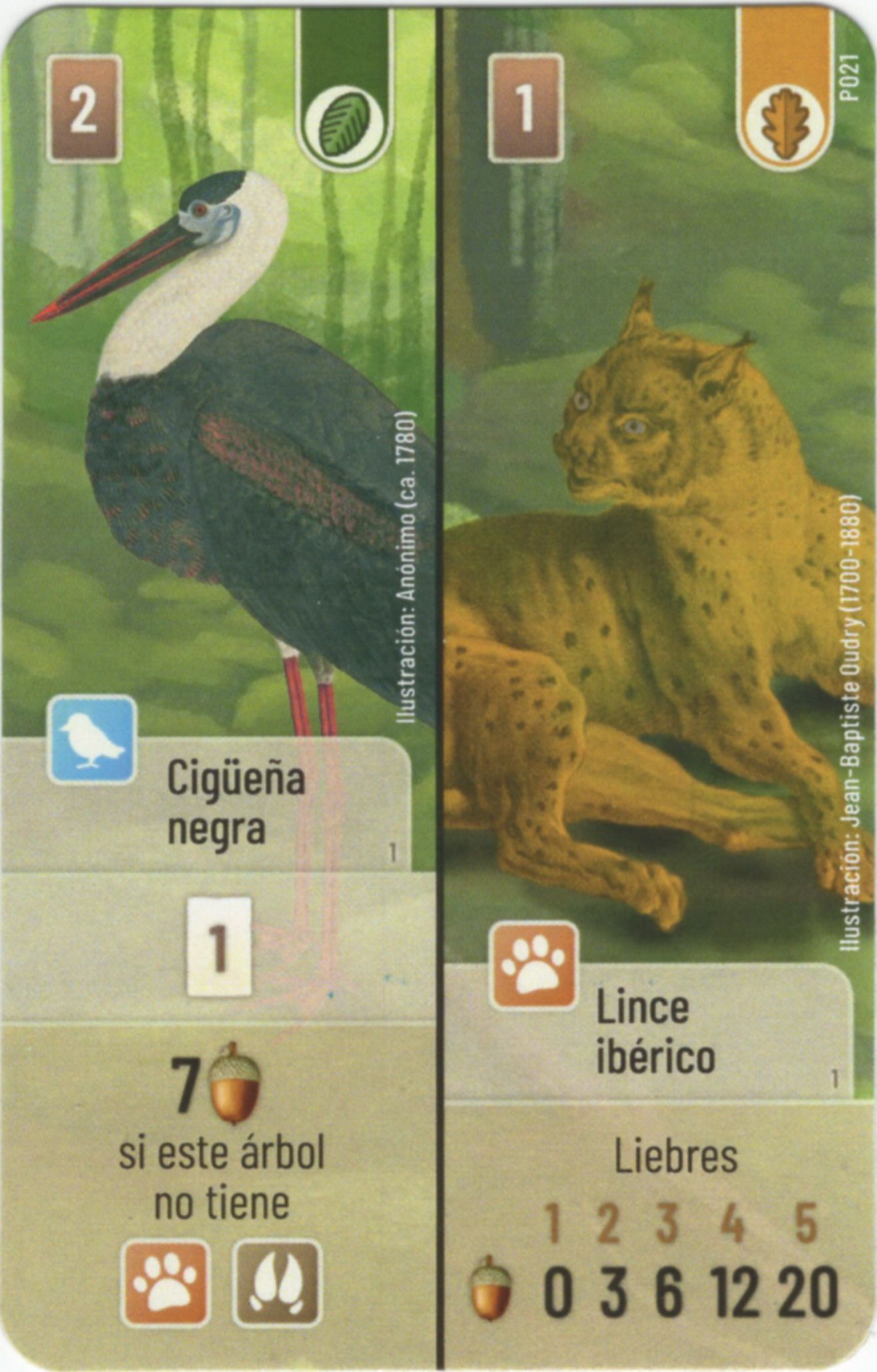 Descrizione: P021 Cigüeña negra (black stork) lets you draw a card and gives 7 points, when its tree does not have any paw or hoofed animal Lince ibérico (iberian lynx) gives points for different amount of hares.