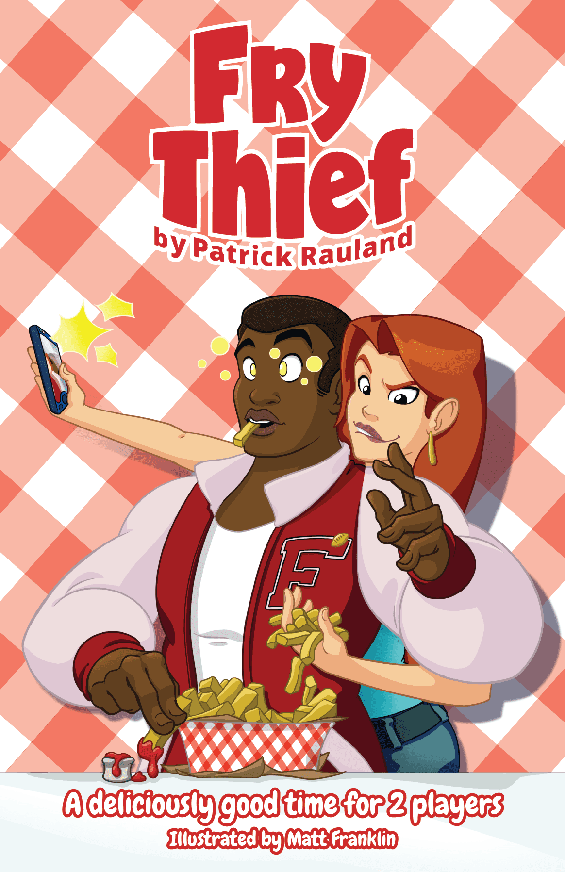 In Fry Thief you fight over the fries. As the salad player you're trying to play cards that let you steal fries and as the burger & fries player you're trying to wolf down as many fries as possible so they can't be stolen.