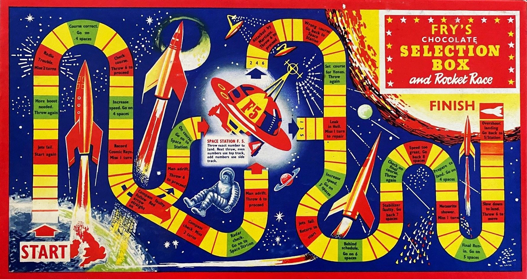 Descrizione: Fry's Chocolate Selection Box Rocket Race was a promotional space game that was printed on the lid of a chocolate box.