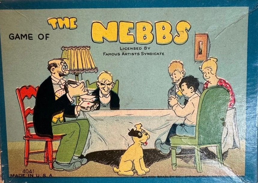 Descrizione: Game is based on the comic strip (also a radio series) The Nebbs by Sol Hess. Deck has 45 cards: 36 suit cards and 9 score cards. Suit cards come in 4 suits named for characters from the comic strip: Nebbs, Potts, Slider, and Max. Each has 9 cards numbered 1-9. Score cards are: Win 1/2/3/5, Lose 1/2/3/5, and one labeled "? - Value of card below". Place the score cards in a face-down stack. Deal each P 9 cards. (for 2-3 players, set the excess cards aside). Play is standard trick-taking. Nebbs are always trump. The winner of the first trick takes the top score card and puts it in front of them. The score cards are then turned face up. The winner of each subsequent trick takes the top score card. After all 9 tricks have been played, each player scores 1 point for each trick taken plus the value of the score cards they took (win cards are positive points, Lose cards are negative points. The value of the "value of card below" score card is equal to the value of the score card below it (this should be recorded when the next score card is revealed. If it is the last score card in the stack, it scores nothing. Player with the most points after 9 hands wins.