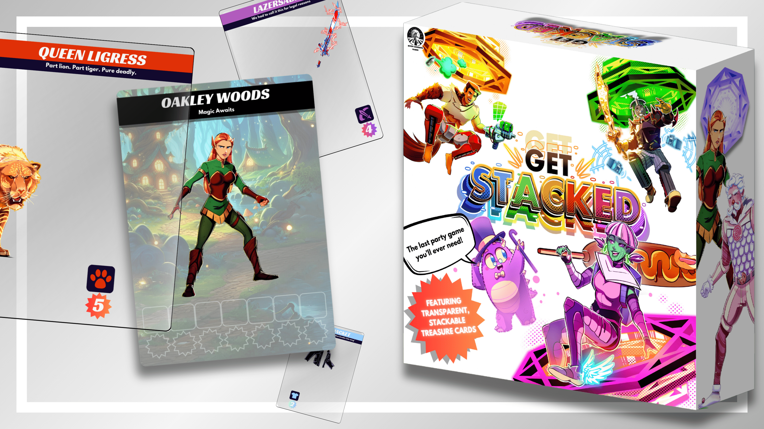 Descrizione: Get Stacked is a strategic party game where players duke it out in a series of fast-paced mini-games to win powerful, stackable treasure and bragging rights. Then, use your hard-earned loot to power up your player to take down monsters and earn victory points. Transparent treasure cards lay directly on your champion to make over 16,000,000+ unique combinations of armor, pets, and more. Utilize specific combos and power levels to defeat monsters and show your competition who's boss.