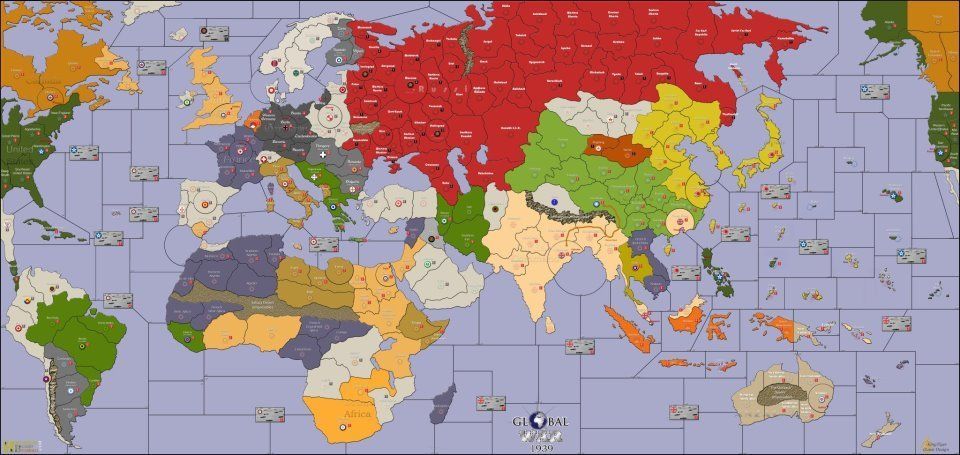 Global War 1939 recreates World War II in it's entirety. The game board is a map of the world divided into controllable areas that have unique values. Players are divided between Axis and Allied powers to fight for global supremacy using a variety of combat units familiar to Axis & Allies players. Victory goes to the player/players that take control of a number of enemy Victory Cities.