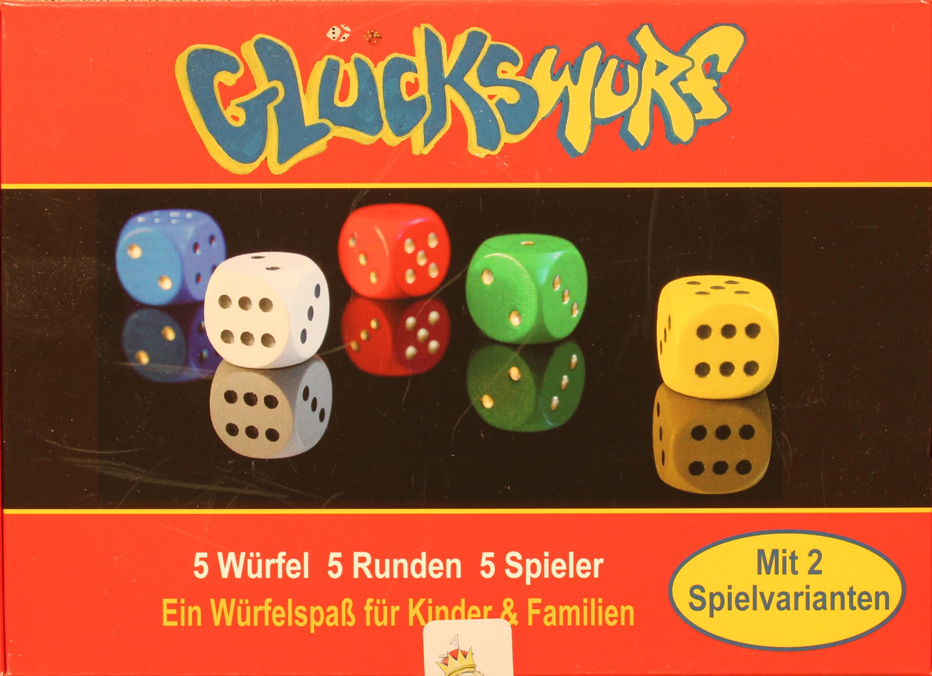 Descrizione: Glückswurf is a party dice game with two different variants. The players roll the dice and collect their points. They receive lucky tokens in exchange for either noting the points or winning the most games. They can exchange the tokens for little prizes (not included in the game).