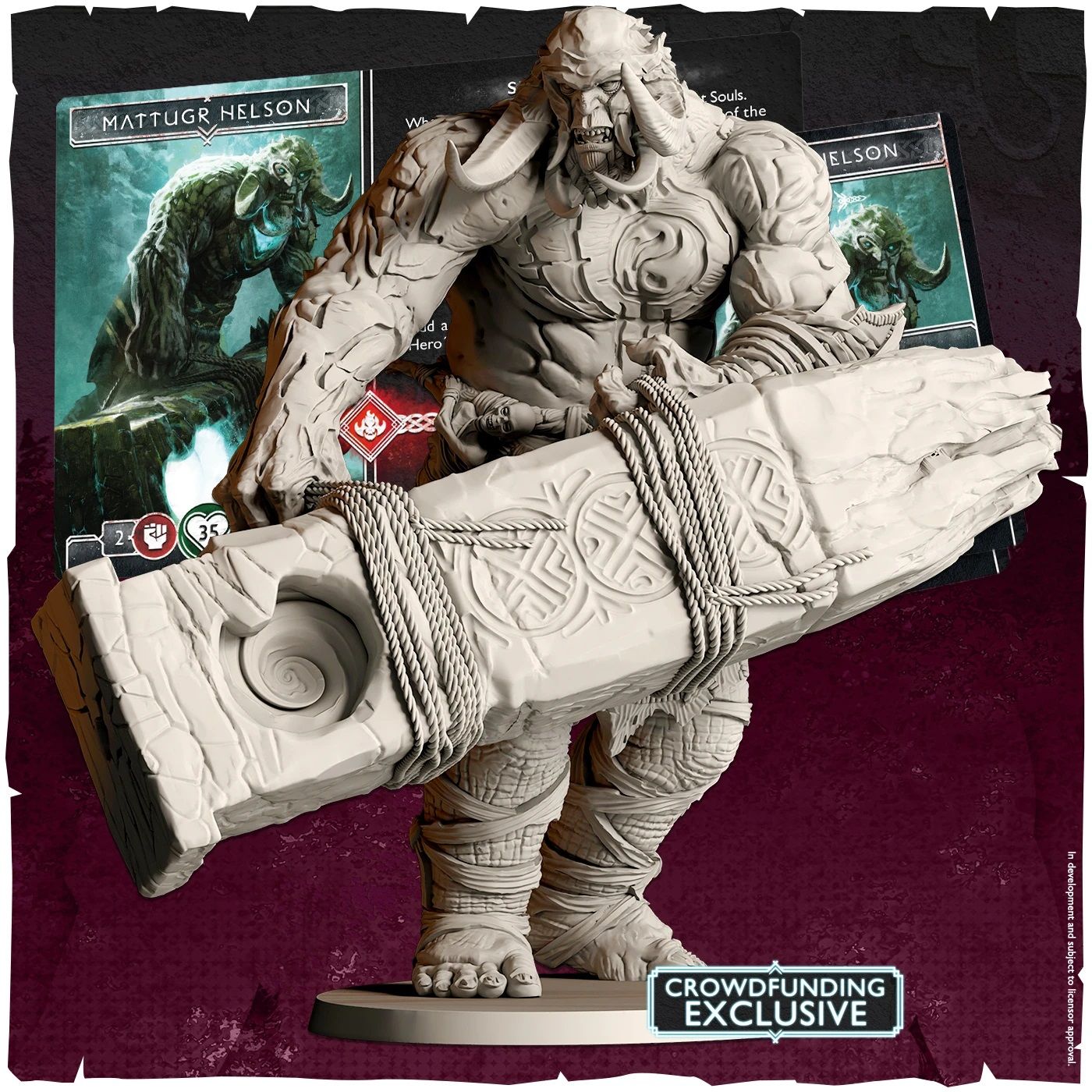 Descrizione: Also known as The Bridge Keeper, Máttugr Helson was appointed to make sure that only those who are deceased traverse the Bridge of the Damned. Empowered with a totem that contains the very energy of Helheim, this Hel Troll not only commands the ferocity of his kin but also wields authority over the shadows of the Realm of the Dead itself, being capable of summoning minions from the depths. Crowdfunding Exclusive 1 Miniature, 1 Boss card, and 2 Behavior cards