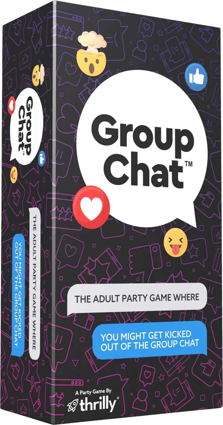 Descrizione: In the party game Group Chat, you build text threads, then anonymously vote with thumbs down and hearts to decide who the best and worst texter was. Whoever gets the most red hearts wins the round, and whoever gets the most thumbs down gets kicked out of the chat next round. Play until someone wins seven rounds.