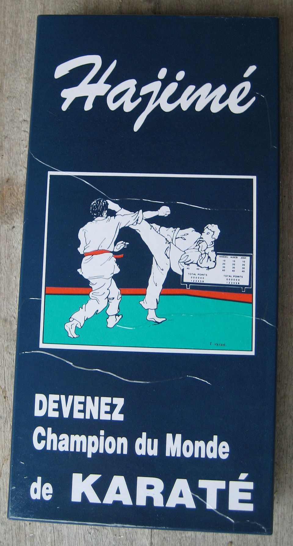 Descrizione: Hajimé is a simulation of a karate competition fight. Each player has two dice and a hand of six cards. The black cards are used for attack, the red ones for defense. The die is used both to move the karateka and to choose an attack, depending on the value of the black cards in hand. The defending karateka can either play a red card or retreat on a roll of the dices. If he leaves the tatami, he is warned by the referee. The "lack of control" defense card can also result in a warning from the referee for the attacker. Instead of fighting, players can exchange one or more cards from their hand. At the end of each round, they must replenish their hand to six cards. The fight ends when the draw pile is exhausted. The winner is the one who has scored the most points; in the event of a tie, penalties are taken into account. A scoreboard is provided in the bottom of the box.