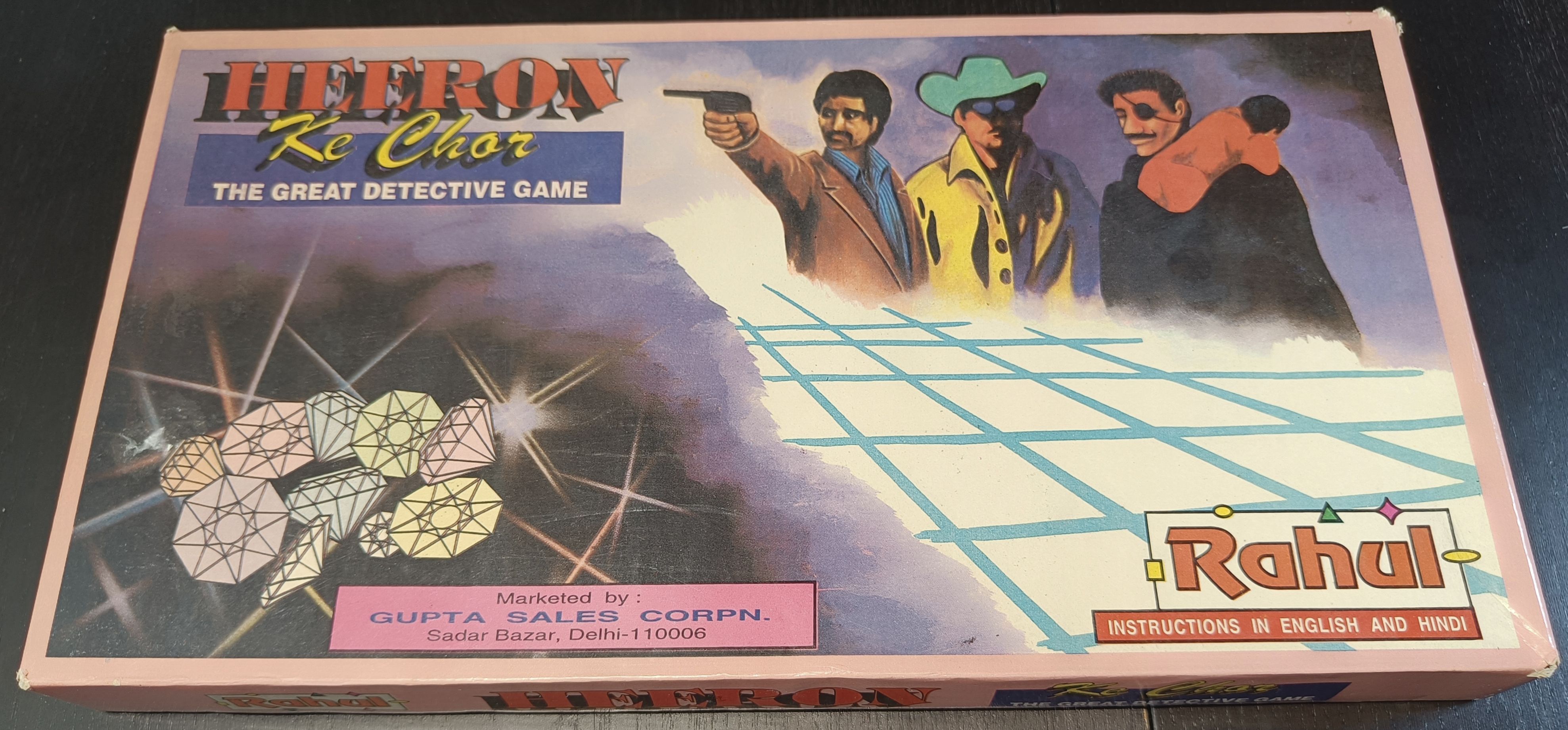 Heeron Ke Chor is roll and move game in 24*24 grid. Every player starts from their own corner and tries to get all of their 4 pieces to the central space, where the auction takes place.