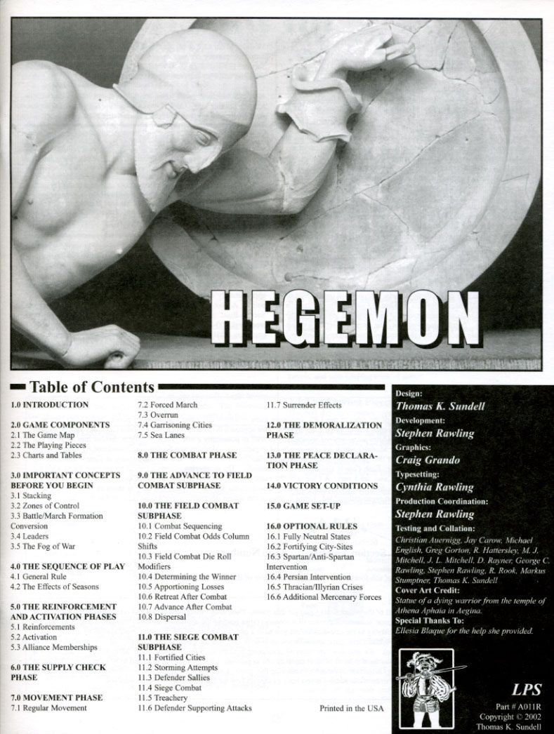 Hegemon is an operational simulation for two players which recreates the efforts of Athens and Thebes to withstand the Makedonian pursuit of Hellenic hegemony in the crucial years of 339-338 BC. One player commands the forces of Athens, Thebes, and their allies (the Hellenes), while the other controls the Makedonian army and its allies (the Makedonians).