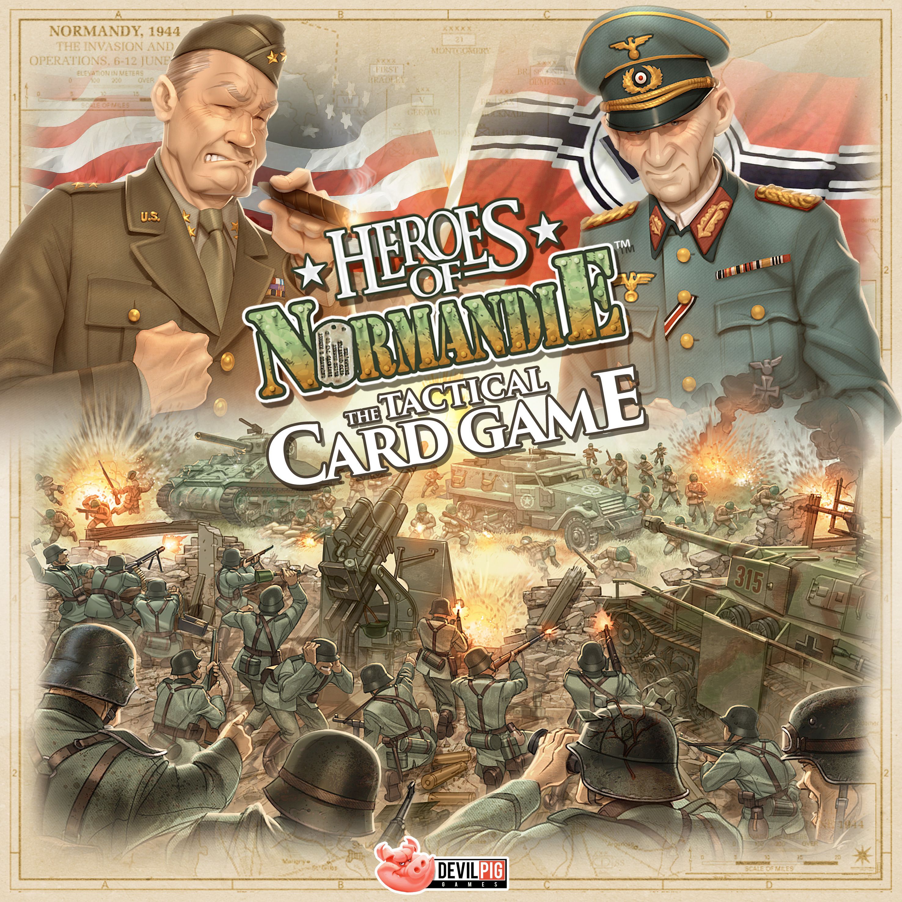 You will manage companies instead of platoons to conquer bigger battlefields. Unit tokens are replaced by cards, terrain tiles are replaced by maps. We introduce a new set of rules, but don't worry, if you are familiar with Heroes of Normandie, you won't be lost and will find it very easy.