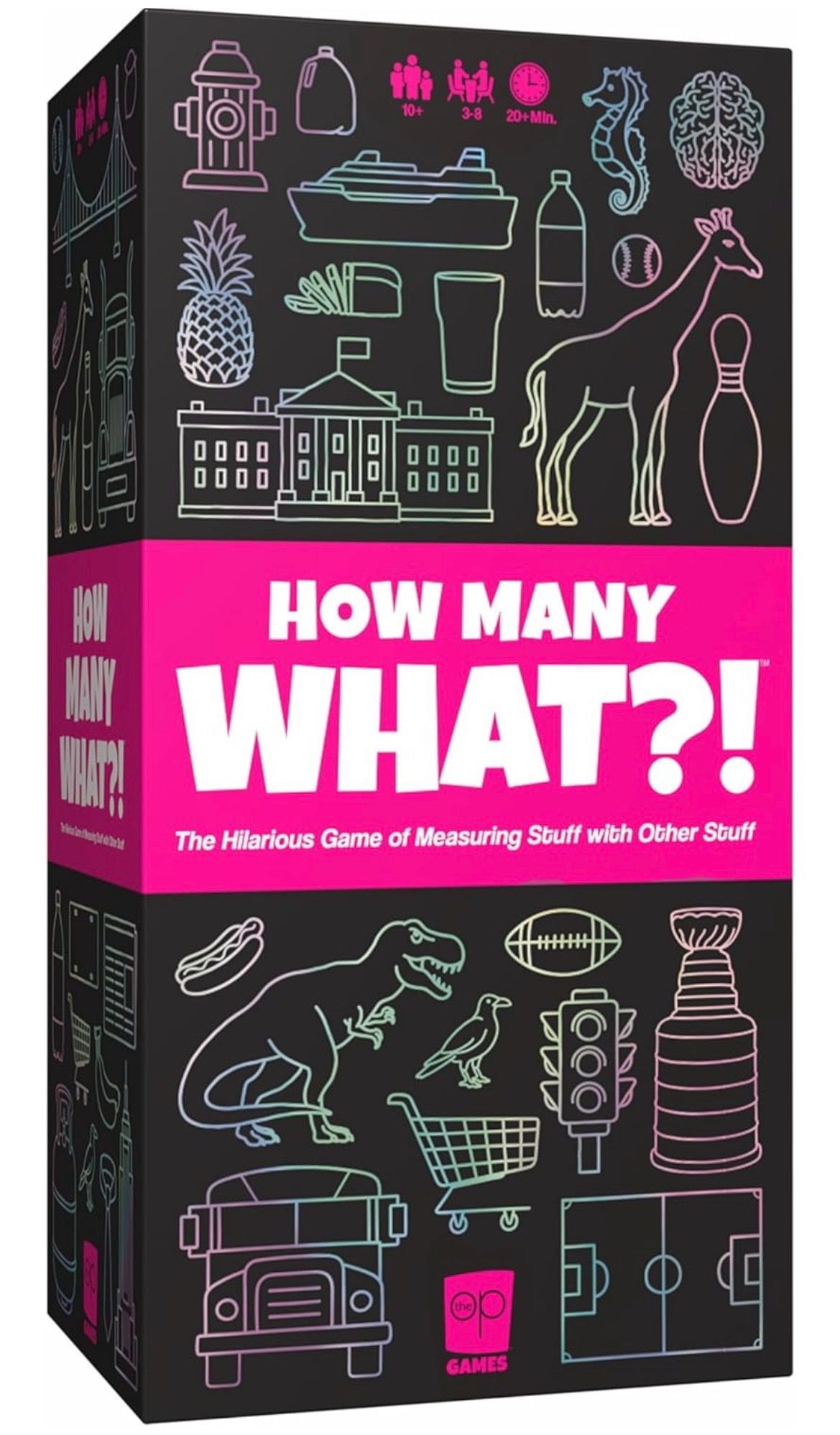 Descrizione: Did you know that a T-REX is 8 PEACOCK FEATHERS tall and that a BLUE WHALE weighs as much as 21 SCHOOL BUSES? Some people will use anything but the metric system to measure things! How Many What?! is the ridiculous party game of absurd comparisons.