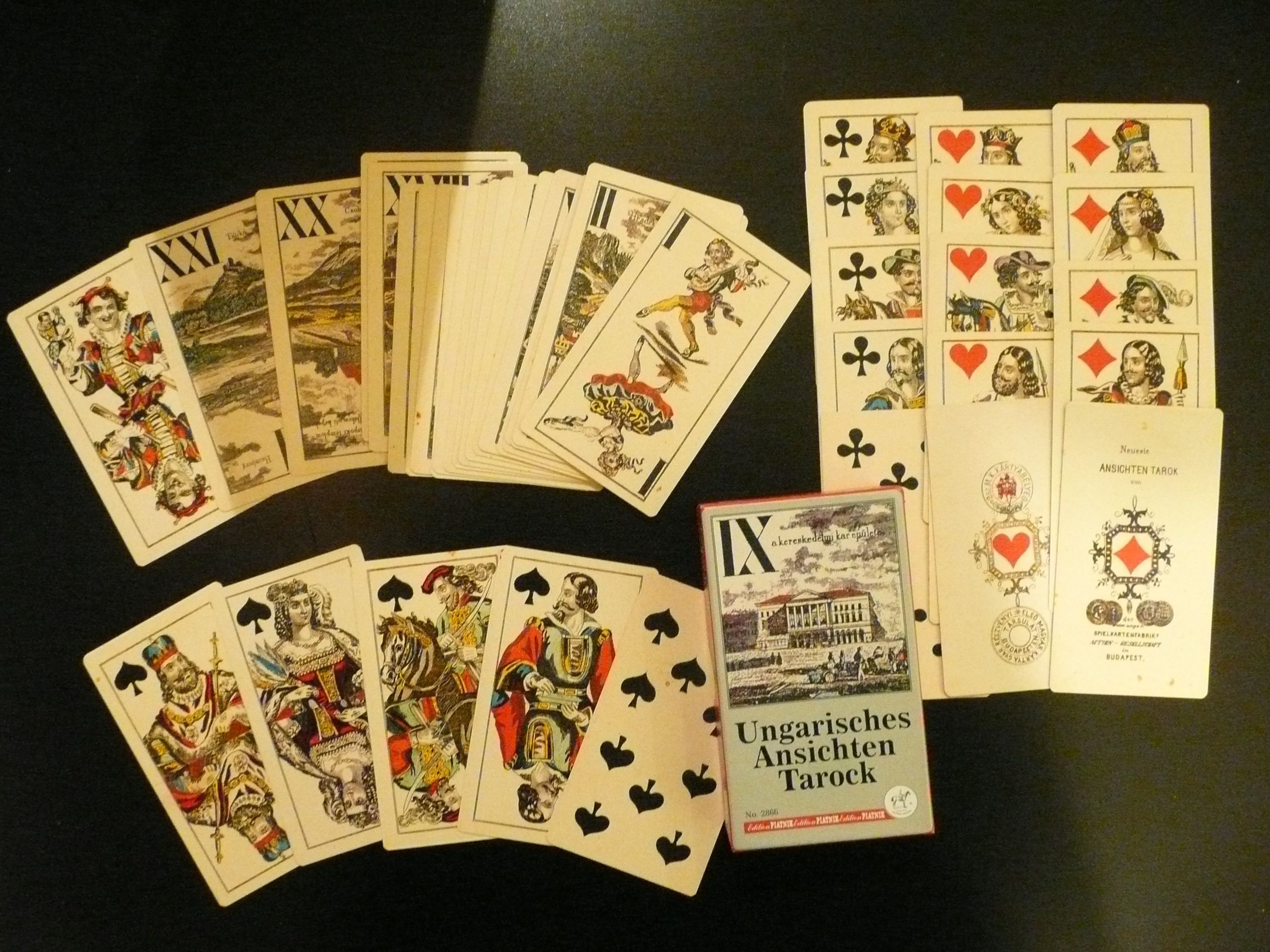Descrizione: Hungarian Tarokk, also known as Húszashívásos tarokk (XX-calling tarokk), or Paskievics tarokk, is a four player, variable partnership, trick taking tarot game. As with most games in this genre, the base objective of each round is to capture a certain amount of card points (in this case, more than half) in tricks. However, each round of Hungarian Tarokk starts with a peculiar round of auctions and announcements that impart a lot of information about the players' hands, which make it a very skillful, challenging, yet surprisingly accessible game.