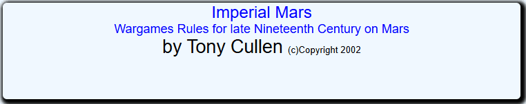 Okay, so enough of justification, what are these rules all about. Well they were initially designed to provide a fun system for fighting actions on Mars between the gallant British colonial forces and the strange alien creatures of the Red Planet. The rules were originally intended to focus on the late 1870's, the height of the colonial period, before automatic machine guns grew to dominate the battle field, and close enough to the Franco-Prussian and Zulu wars to provide a goodly quantity of figures.