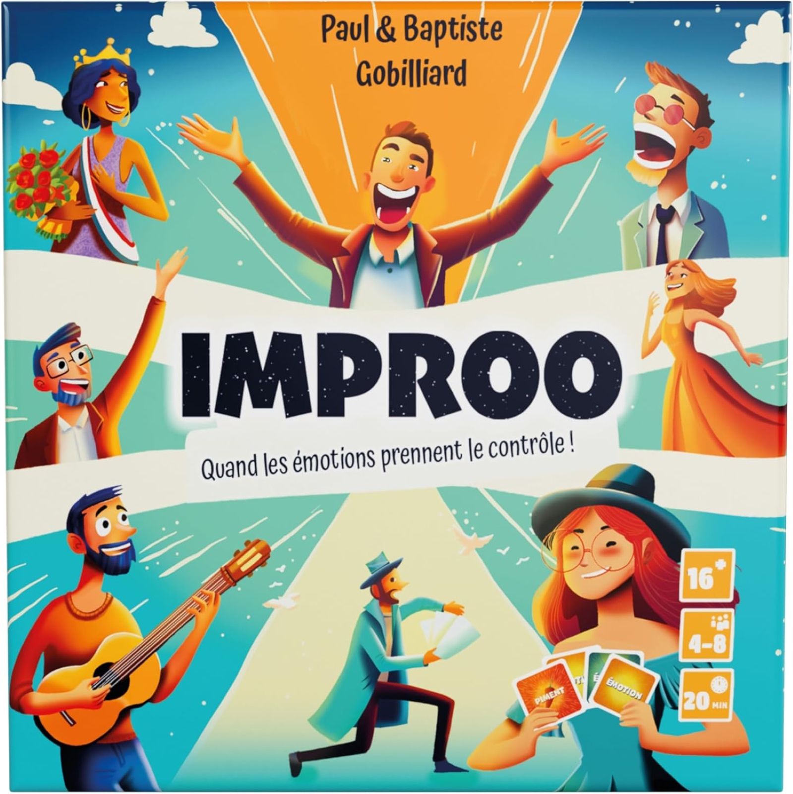 Descrizione: IMPROO, WHEN YOUR EMOTIONS TAKE CONTROL! Unleash your creativity and improvisational skills by embodying the emotions dictated by the cards! Whether you're an acrobatic sheep tamer or a raid negotiator, your challenge is simple: Seduce the JUDGE with your interpretation while remaining faithful to the emotion indicated on your card. —description from the publisher (translation) IMPROO, QUAND TES ÉMOTIONS PRENNENT LE CONTRÔLE ! Libère ta créativité et ton sens de l’improvisation en incarnant des émotions imposées par les cartes ! Que tu sois un dompteur de moutons acrobate ou un négociateur du raid, ton défi est simple : Séduire le JUGE avec ton interprétation tout en restant fidèle à l‘émotion indiqué sur ta carte. —description from the publisher