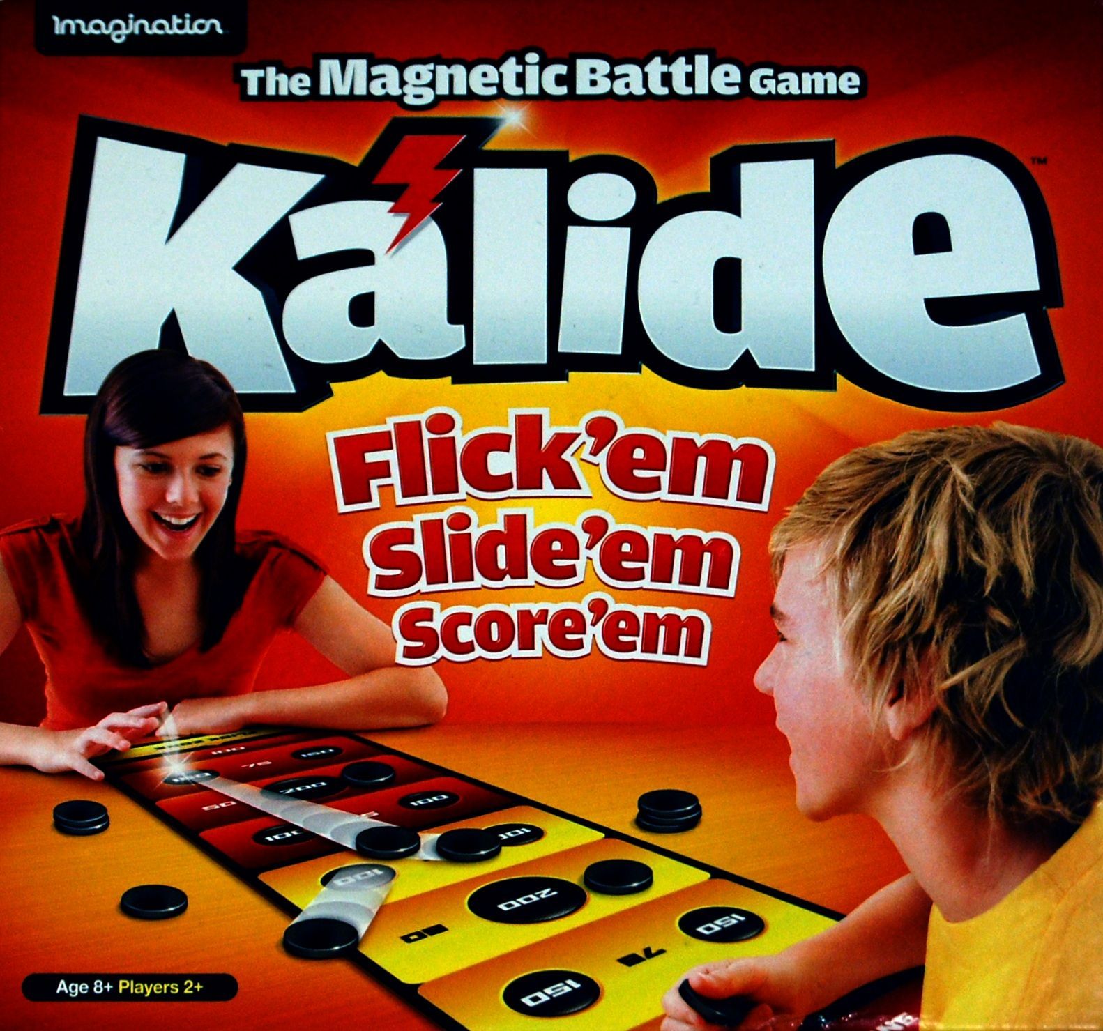 Descrizione: "Play one-on-one or in teams as you flick and flip your way to winning the all-new, exciting magnetic game Ka’lide! Flick your magnetic pucks to bend around your opponents’ or flip your pucks over and use their magnetic power to repel your opponent’s pucks off the mat and out of the game. Expertly create puck clusters and you could double, triple and even quadruple your score."