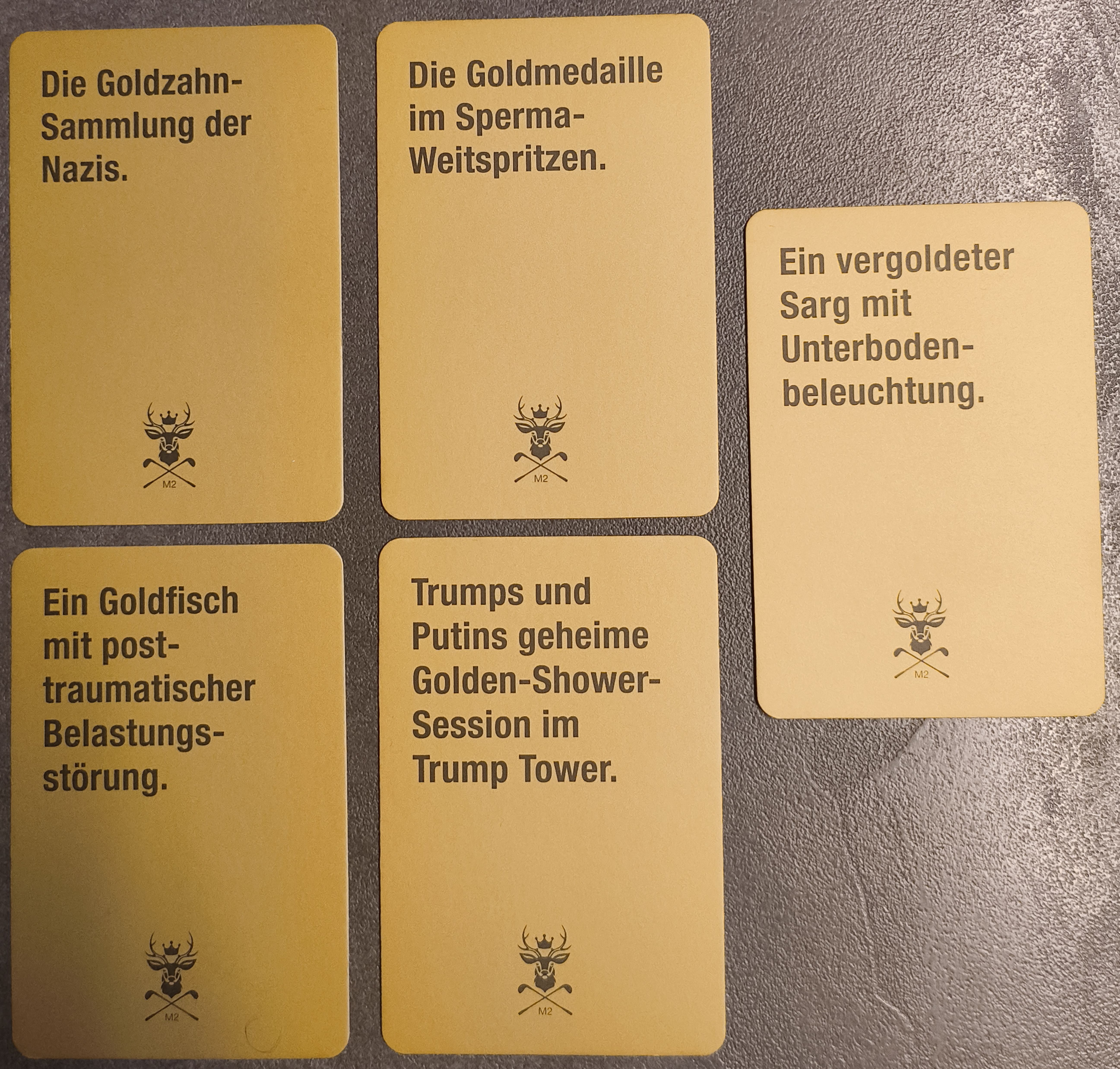 Descrizione: This promo set adds new golden answer cards with absurd and satirical content. These include a gilded coffin with underlighting, a goldfish with post-traumatic stress disorder, Trumps and Putins secret Golden-Shower sessions, Nazi gold-tooth collections, and the gold medal in sperm-long-jump. The cards expand the variety of humorous responses players can use in the game. ••• Dieses Promo-Set fügt neue goldene Antwortkarten mit absurden und satirischen Inhalten hinzu. Diese sind ein vergoldeter Sarg mit Unterbodenbeleuchtung, ein Goldfisch mit posttraumatischer Belastungsstörung, Trumps und Putins geheime Golden-Shower-Sessions, die Goldzahn-Sammlung der Nazis und die Goldmedaille im Sperma-Weitspritzen. Die Karten erweitern die Auswahl an humorvollen Antworten, die Spieler im Spiel verwenden können.