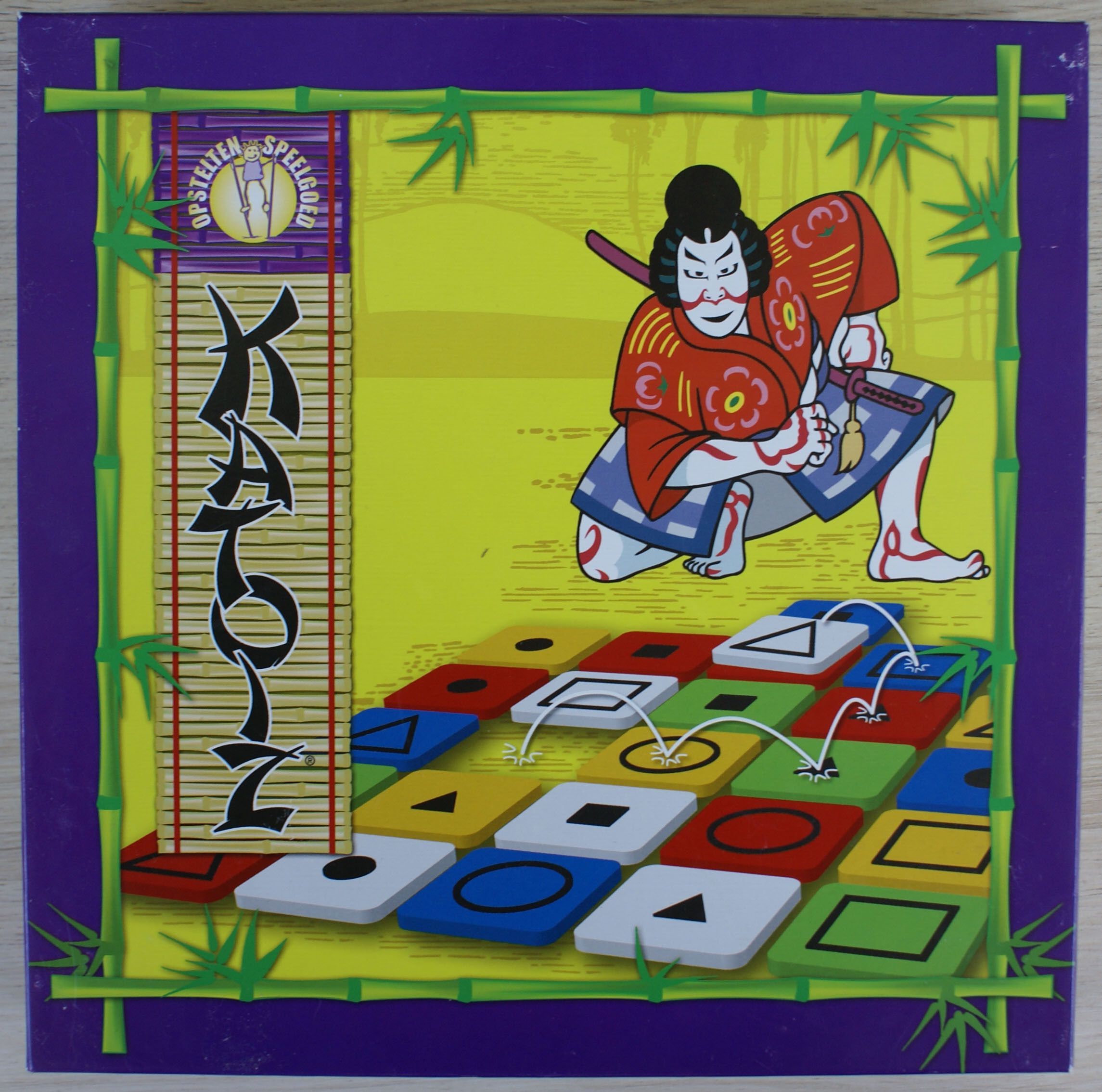 Descrizione: Katoi or since 2006 Katoiz consists of a 6x6 board build up with tiles. These tiles have 3 characteristics: form (square, triangle or circle), color (blue, red, green, yellow or white) and size (big or small). In the base game you try to make a stack of tiles. To move the tiles around you can move a tile horizontally of vertically if 1 characteristic with the adjacent tile corresponds. To move diagonally, 2 characteristics have to correspond.