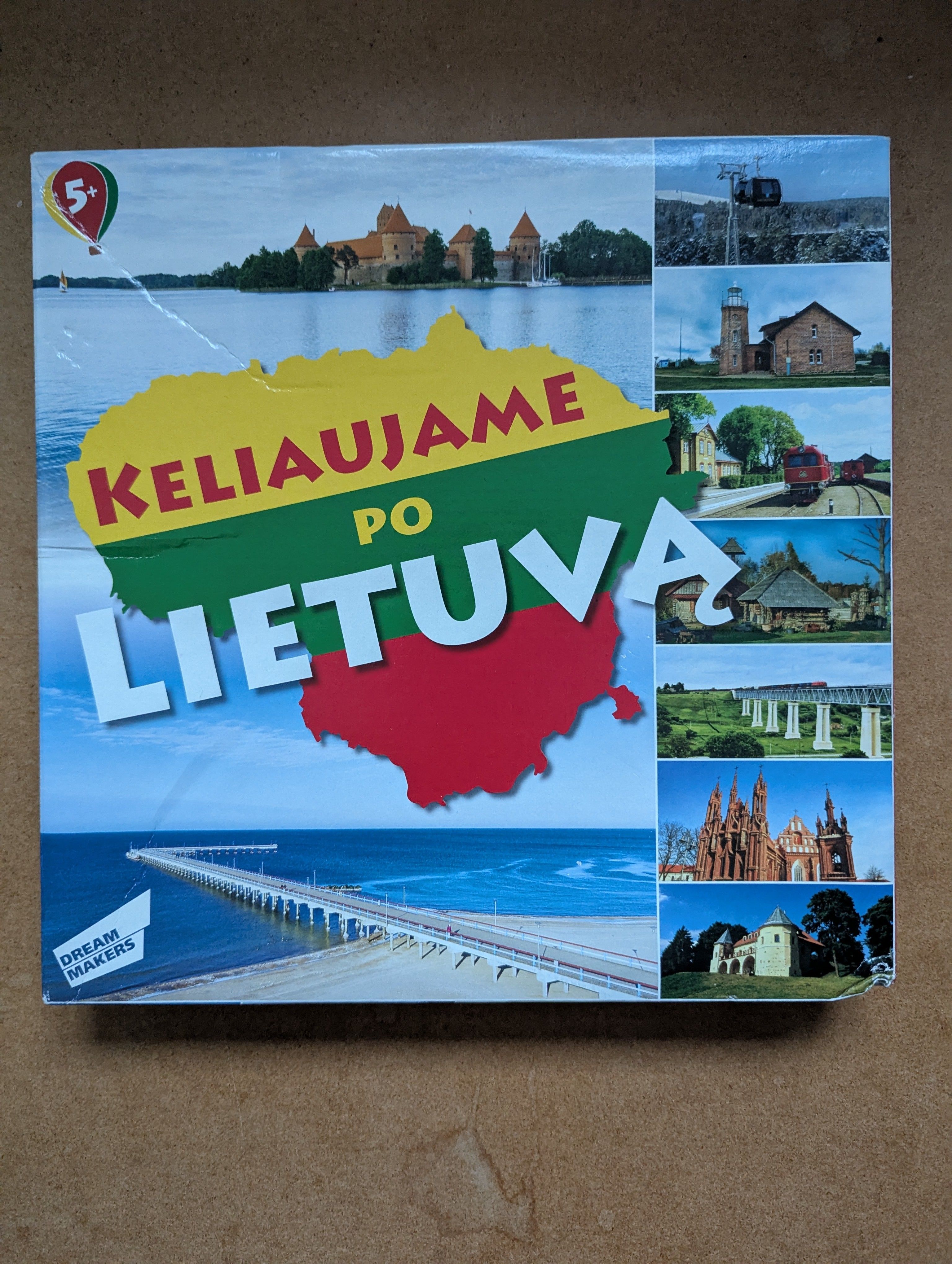 The game deck consists of 40 cards, each showing a tourist point of interest in Lithuania and a set of 2–4 die rolls that are required to successfully visit it. Cards with 2, 3, 4 dice on them are worth 1, 2, 3 points respectively (this point value is also shown on the card).