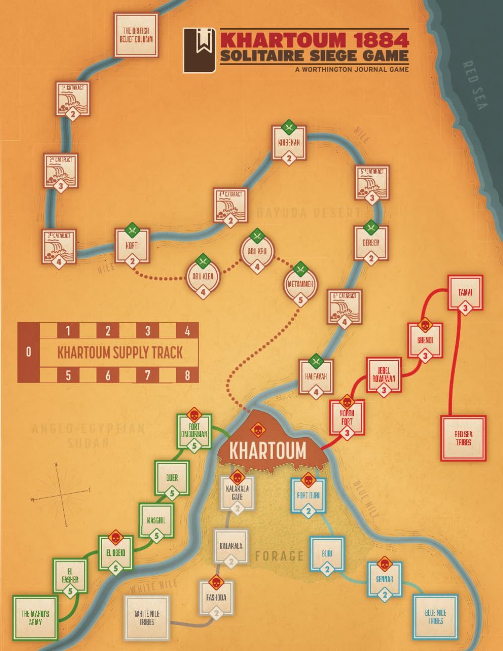 Khartoum 1884 is a solitaire Journal Game that puts you in command during the Siege of Khartoum in 1884–1885. The cover of your journal is your game board, and inside are the rules, historical notes, and 100 pages for your own writing. Each turn, you’ll defend Khartoum against Mahdist forces closing in along four attack routes, manage scarce supplies, and push the British Relief Column toward the city before it’s too late.