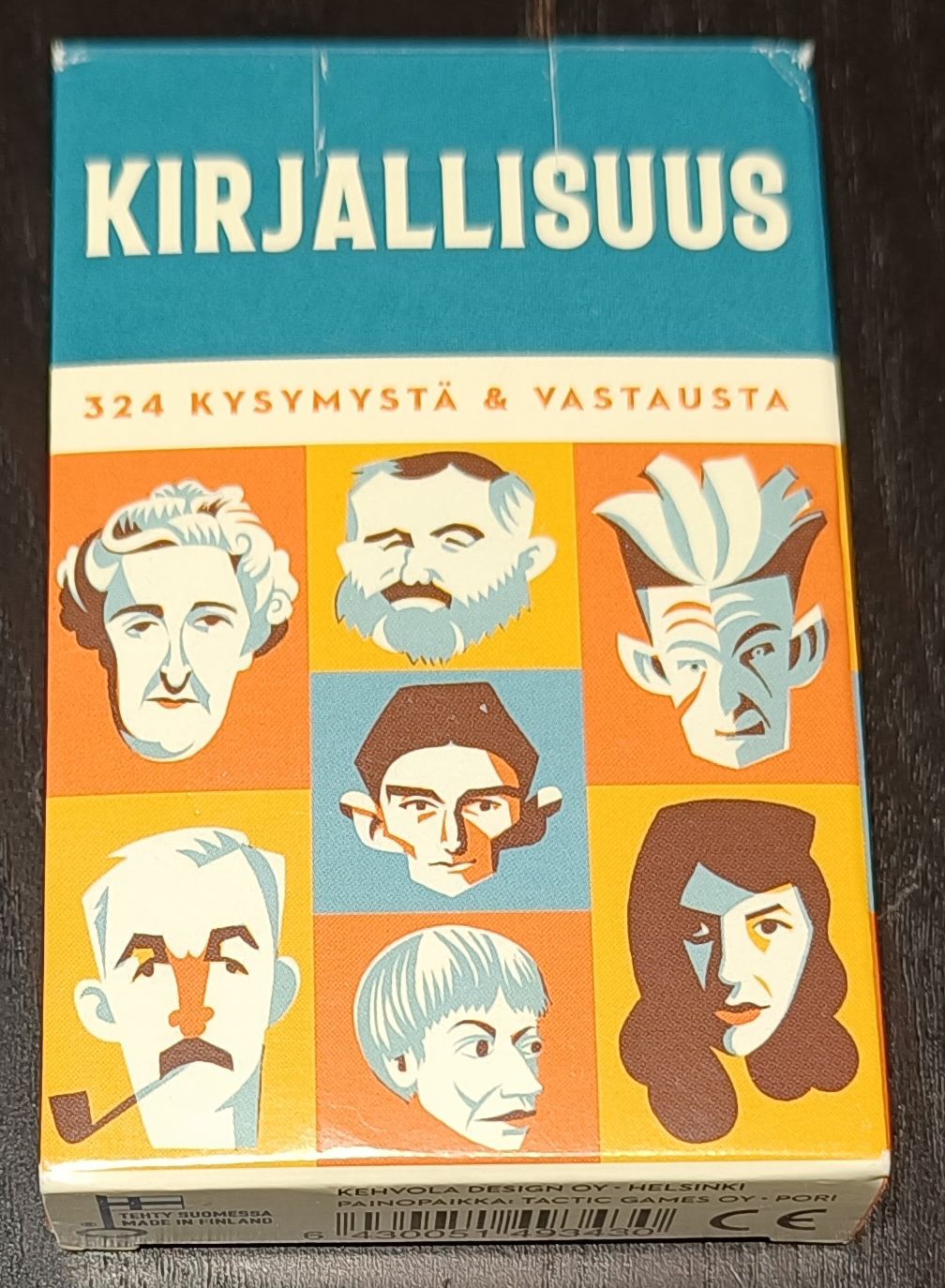 Descrizione: 324 literature themed questions for all book lovers. Answers on the back of the card. Illustrated with portraits of 54 artists related to the questions. There are three sets of possible game modes: 1. Everybody gets one card. First player asks a question from the next player. If the answer is correct she/he gets one point. If the answer is wrong, then it's next players turn to try and so on. After the correct answer has been given or nobody knew the answer, the second player ask question from her/his card and so on. 2. Everybody gets one card. First player asks a question. Others in turn order say, if they know the answer or are just guessing. Guessers may answer first in turn order and if all the guesses where wrong, then it is the knowers turn to answer. (For some reason you still get only one point, whether you were guessing or knowing the answer?) After the correct answer has been given or nobody knew the answer, the second player ask question from her/his card and so on. 3. First player asks the question and everybody writes the answers on paper and correct answers give one point. After the correct answer has been given or nobody knew the answer, the second player ask question from her/his card and so on.