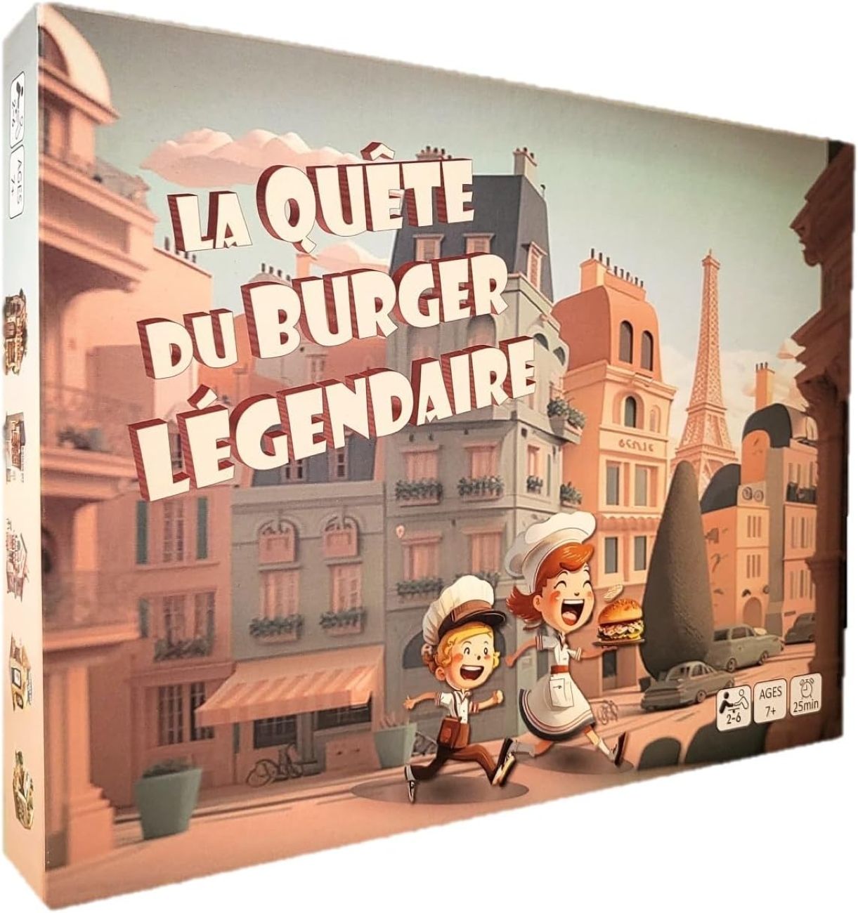 Descrizione: The Quest for the Legendary Burger is a fun game for the whole family, primarily aimed at children (ages 7 to 12). It was designed to allow children to develop their knowledge of topics such as cooking, gastronomy, and agriculture, while also helping them familiarize themselves with the practical application of addition through budget management. Each player plays a kitchen assistant who must travel the city in search of the ingredients needed to prepare a Legendary Burger! To do this, they must visit different merchants to find out the price of their ingredients and thus manage their wallet throughout the game. Along the way, they will have to collect money to build up a small budget and thus be able to make their purchases. When the player has collected enough money to buy the ingredients for the recipe, they win the game. During the game, the children will interact with each other in different ways: They will be encouraged to ask each other questions about cooking/agriculture (easy and fun questions to introduce them to these topics); They will also be able to set traps for themselves and thus slow down the other players in their quest! —description from the publisher (translated) La quête du burger légendaire est un jeu amusant, pour toute la famille et principalement destiné aux enfants (de 7 à 12 ans). Il a été conçu pour permettre aux enfants, à la fois, de développer leurs connaissances autour de thèmes tels que la cuisine, la gastronomie et l'agriculture ainsi que de les aider à se familiariser avec l'application pratique des additions via la gestion d'un premier budget. Chaque joueur incarne un commis de cuisine qui doit parcourir la ville à la recherche des ingrédients nécessaires à la préparation d'un Burger de légende! Pour cela, il doit aller rendre visite à différents commerçants pour connaître le prix de leurs ingrédients et ainsi gérer son portefeuille tout au long de la partie. Sur son chemin, il devra récolter de l'argent afin de se constituer un petit budget et ainsi pouvoir réaliser ses achats. Lorsque le joueur a récolté assez d'argent pour acheter les ingrédients de la recette, il gagne la partie. Au cours de la partie, les enfants intéragiront entre eux de différentes manières : ils seront amenés à se poser des questions les uns aux autres, autour des thèmes de la cuisine / agriculture (questions faciles et amusantes pour les initier à ces sujets) ; ils pourront également se tendre des pièges et ainsi ralentir les autres joueurs dans leur quête ! —description from the publisher