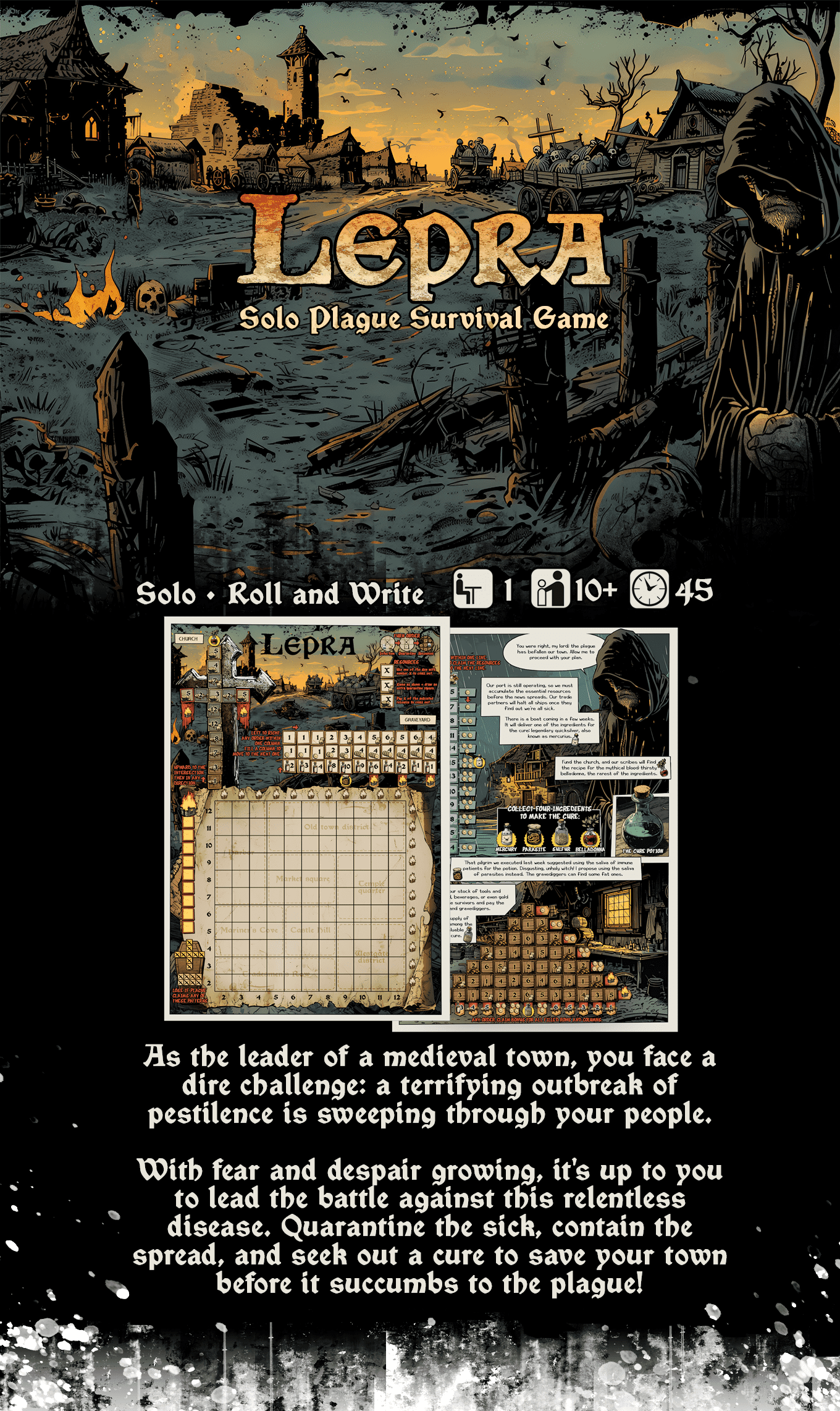 In this roll-and-write game, you'll navigate two pages filled with four thematic game areas and one town map grid. Strategically fill rows and columns of asymmetric action grids, record imported resources, mark off crates of used goods, and secure the four exotic ingredients needed to create the cure.