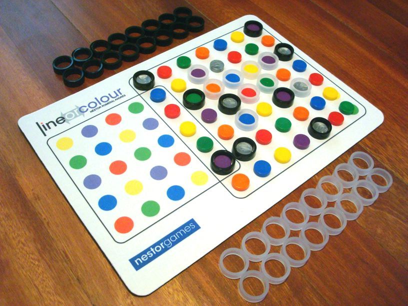 Descrizione: Line or Colour is a combinatorial game for two players. Originally named Tangion (a contraction for Tangent+Tension), the game involves two perpendicular winning conditions that can tie players´ brains in knots. It was derived from Domina 4 by adding a n-in-a-row victory condition and removing piece movement.