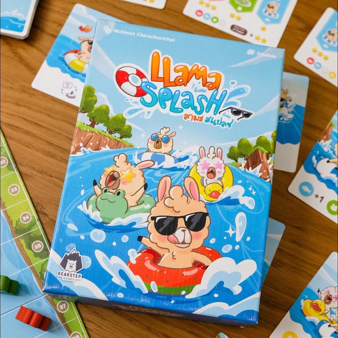 Descrizione: Llama Splash is a fun and lively party game for 2–6 players. Each player receives a unique goal card that shows which colored llamas should finish in 1st, 2nd, and 3rd place. Players take turns rolling dice and playing action cards to move the llamas forward or backward, trying to influence the race to match their secret goals. At the end of the game, points are awarded based on how closely the finishing order matches each player’s card. The player with the highest score wins! —description from the publisher