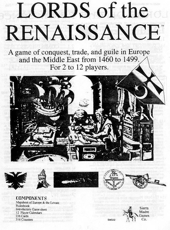 Lords of the Renaissance is a game for 2-12 players set at the end of the Dark Ages. Each player starts as a Merchant Prince of a European Duchy, operating a bank or merchant company speculating in the silk trade. Players also act as a military or financial adviser to one of the great empires, advising their suzerains in matters of conquest, shipbuilding, and the construction of cathedrals and libraries. Through the establishment of trade routes and the paying of tributes, players grow rich, as they are emboldened to fight to protect their monopolies or expand their influence. Plenty of Machiavellian intrigue as players shift allegiances and conspire to become emperors themselves.