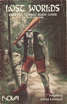 Descrizione: Lost Worlds is the most popular entry in Alfred Leonardi's line of book games, which also includes Ace of Aces. Each player has a character card and a booklet (and sometimes special Tactics, Luck, or Spell cards) for one of about fifty (and growing) medieval-fantasy characters. Characters can range from barbarian warriors to animated skeletons to elven archers to unicorns — even two different dragons. Booklets are traded and, as each player selects a move, a reference grid in the books determine the results (wounds, off-balance maneuvers, and so on). Combat continues until one fighter or the other expires.